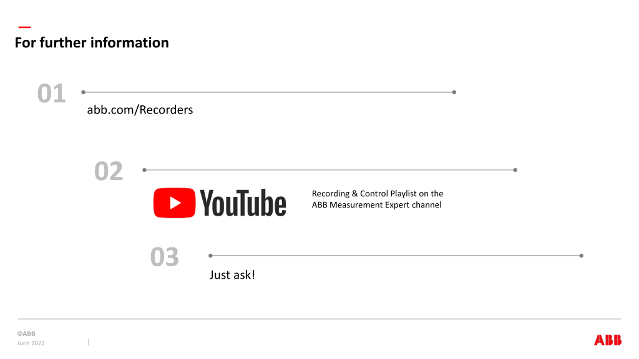 For further information 01 abb.com/Recorders 02 Recording & Control Playlist on the ABB Measurement Expert channel 03 Just ask! June 2022