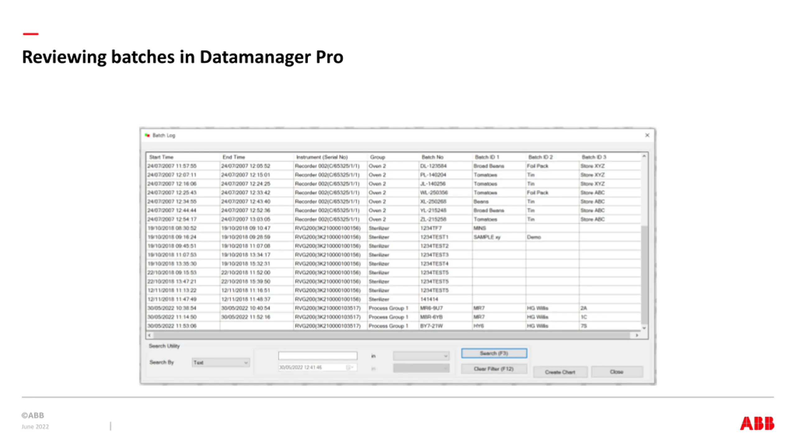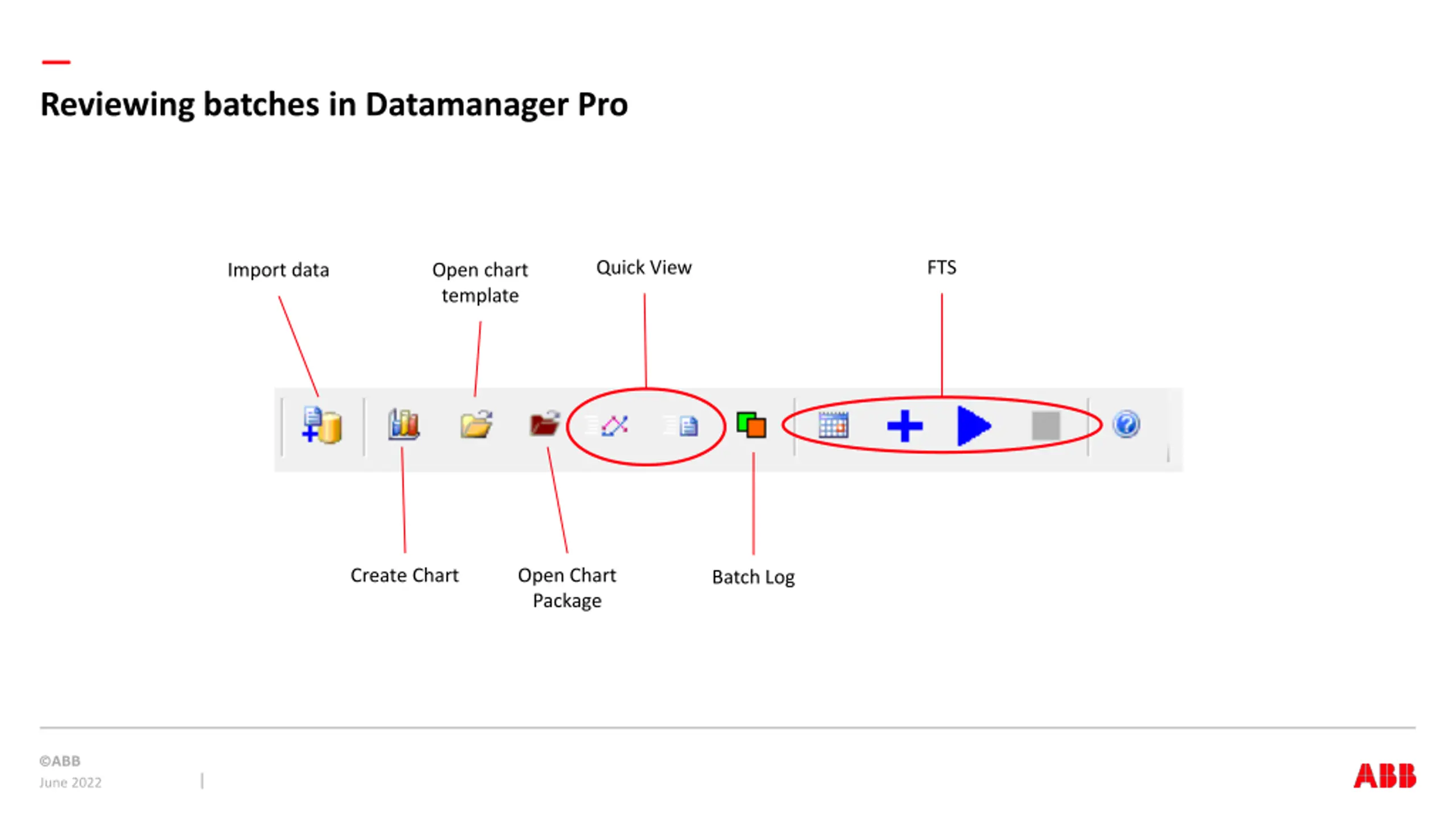 Reviewing batches in Datamanager Pro Quick View FTS Import data Open chart template Create Chart Open Chart Package Batch Log June 2022