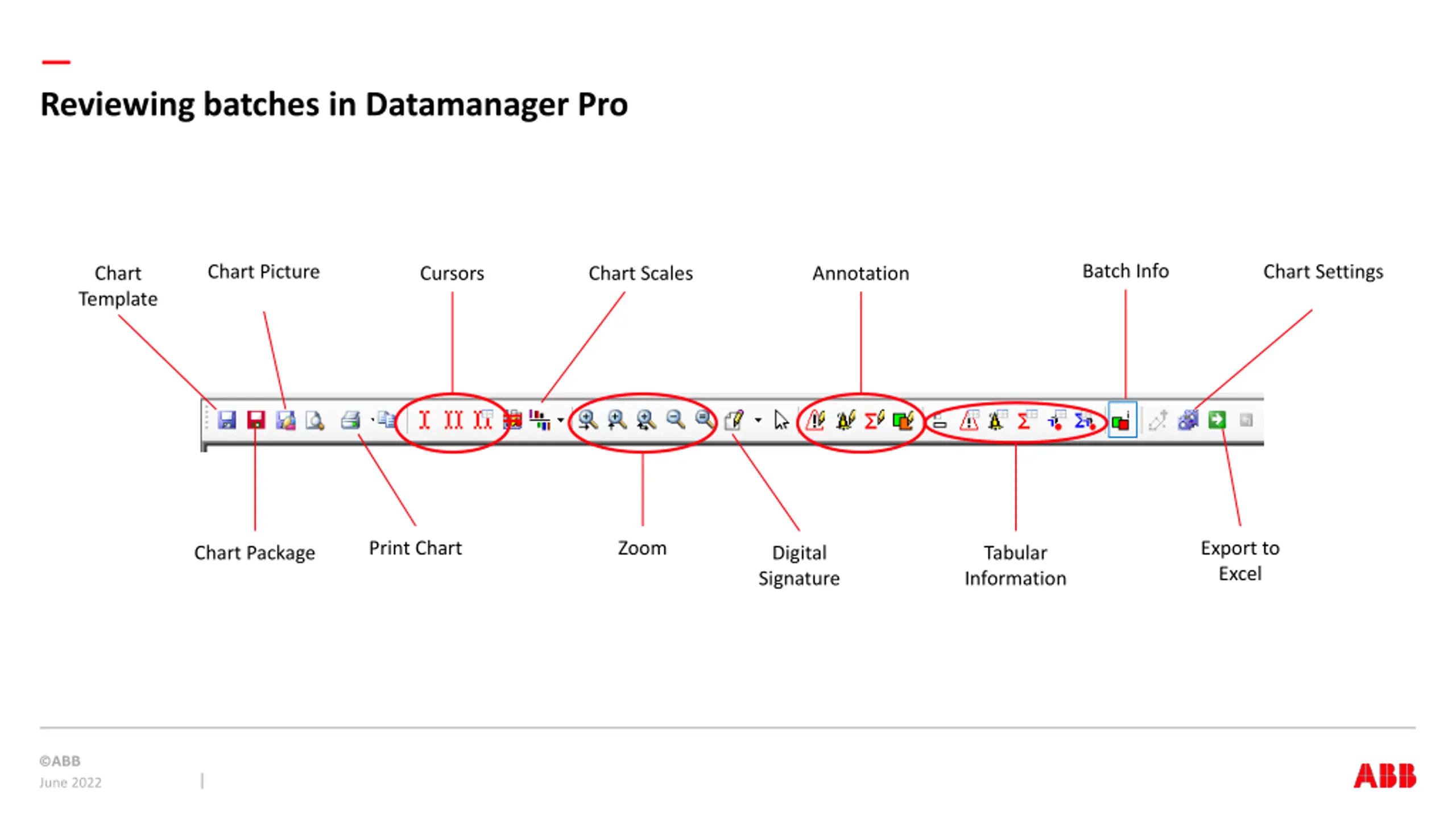Reviewing batches in Datamanager Pro Batch Info Chart Picture Chart Settings Chart Template Cursors Chart Scales Annotation Print Chart Zoom Export to Excel Chart Package Digital Signature Tabular Information June 2022