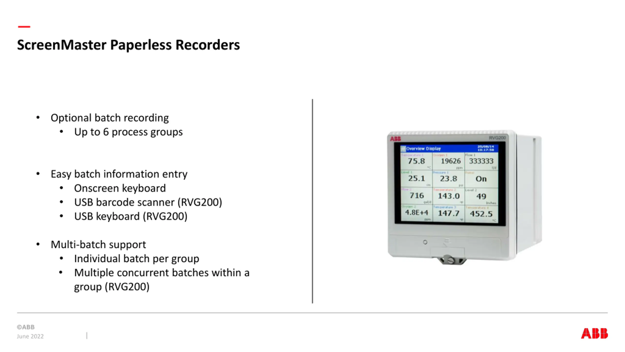 ScreenMaster Paperless Recorders Optional batch recording Up to 6 process groups Easy batch information entry Onscreen keyboard USB barcode scanner (RVG200) USB keyboard (RVG200) Multi-batch support Individual batch per group Multiple concurrent batches within a group (RVG200) June 2022