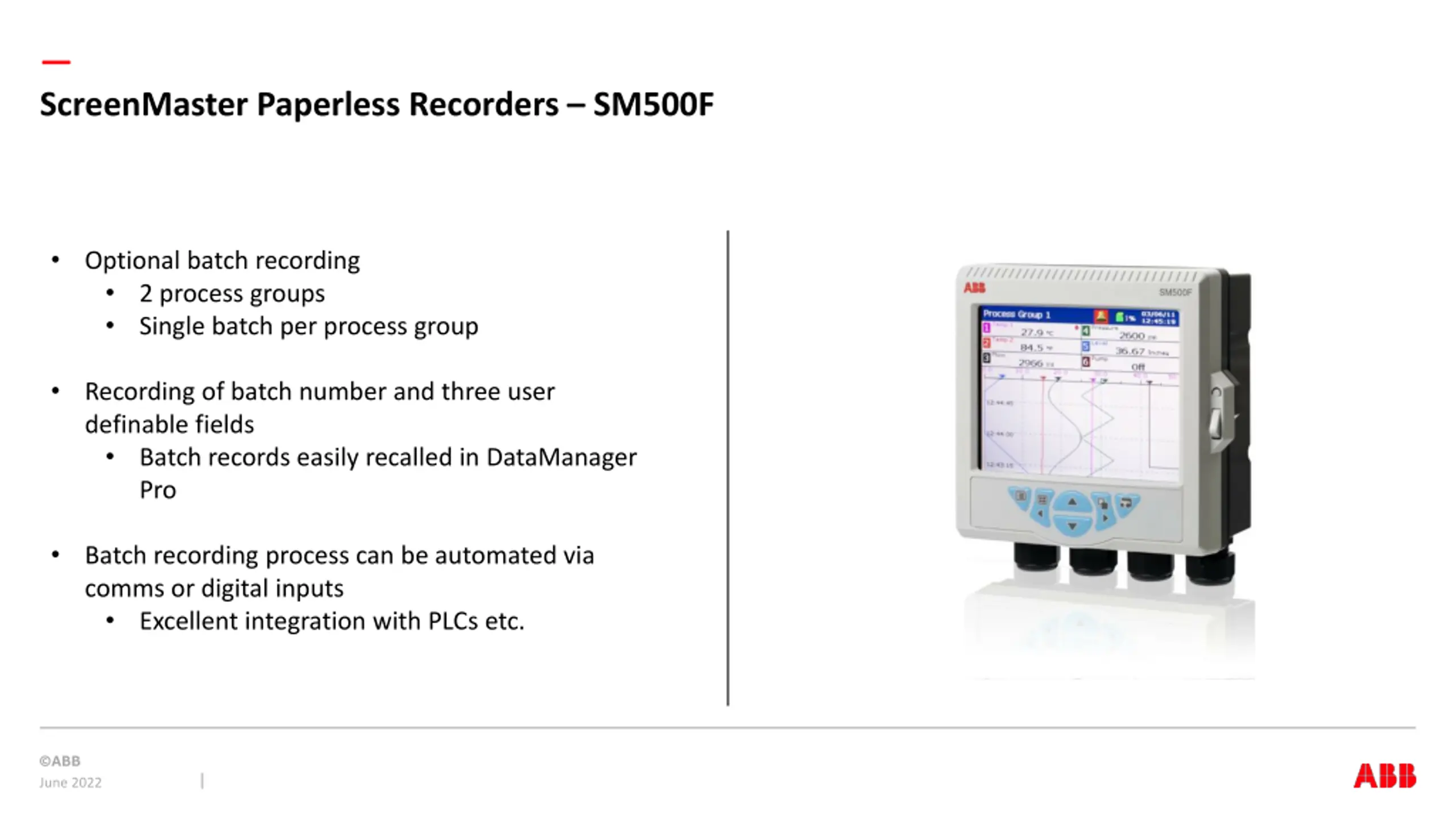 ScreenMaster Paperless Recorders SM500F Optional batch recording 2 process groups Single batch per process group Recording of batch number and three user definable fields Batch records easily recalled in DataManager Pro Batch recording process can be automated via comms or digital inputs Excellent integration with PLCs etc. June 2022