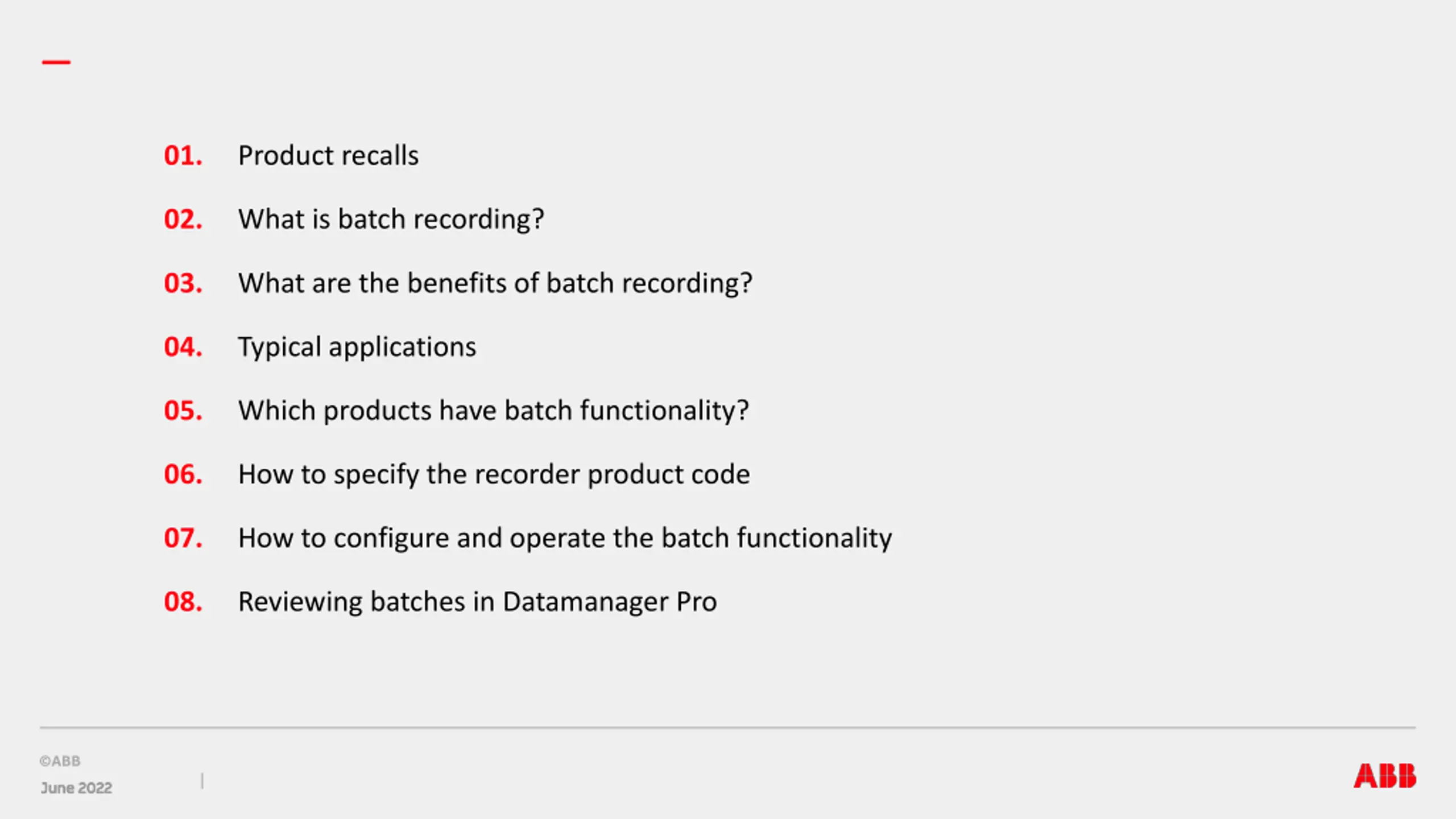 01. Product recalls 02. What is batch recording? 03. What are the benefits of batch recording? 04. Typical applications 05. Which products have batch functionality? 06. How to specify the recorder product code 07. How to configure and operate the batch functionality 08. Reviewing batches in Datamanager Pro