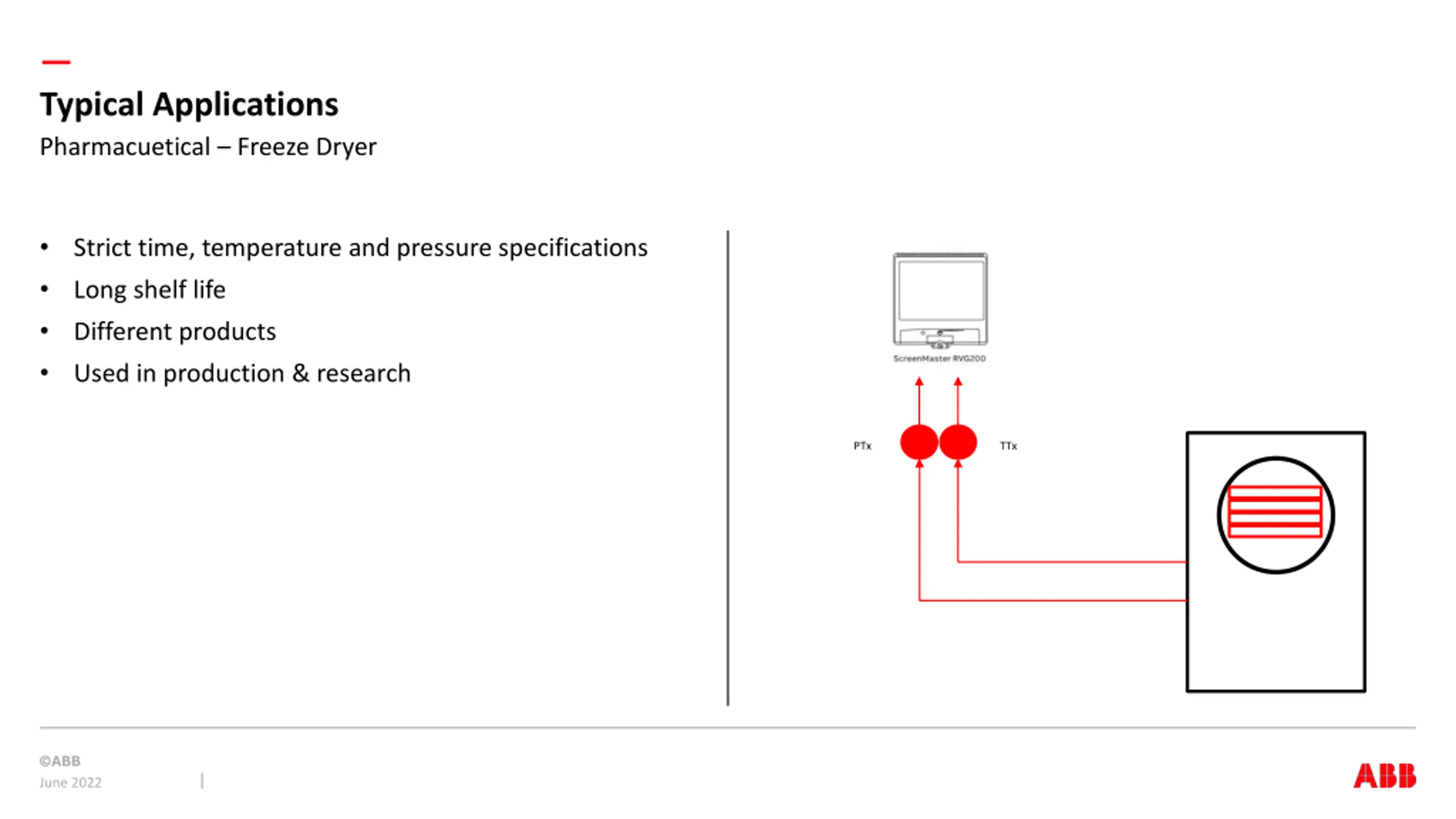 Typical Applications Pharmacuetical Freeze Dryer Strict time, temperature and pressure specifications Long shelf life Different products Used in production & research TTx PTx June 2022