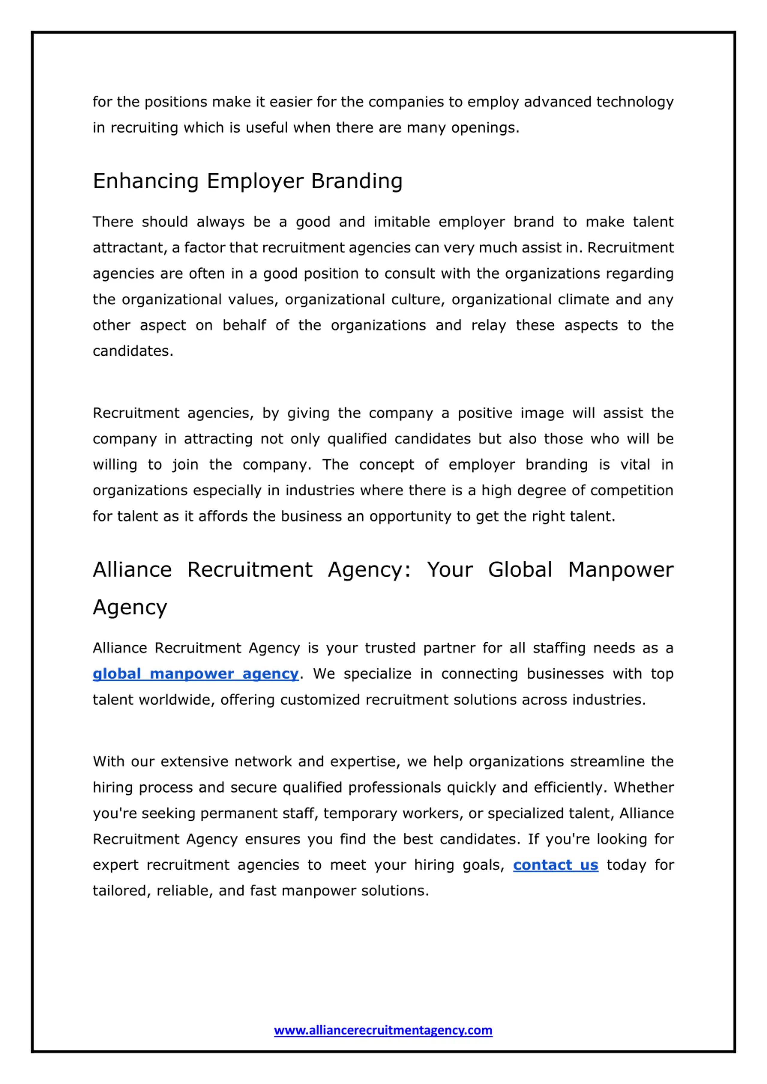 for the positions make it easier for the companies to employ advanced technology in recruiting which is useful when there are many openings. Enhancing Employer Branding There should always be a good and imitable employer brand to make talent attractant, a factor that recruitment agencies can very much assist in. Recruitment agencies are often in a good position to consult with the organizations regarding the organizational values, organizational culture, organizational climate and any other aspect on behalf of the organizations and relay these aspects to the candidates. Recruitment agencies, by giving the company a positive image will assist the company in attracting not only qualified candidates but also those who will be willing to join the company. The concept of employer branding is vital in organizations especially in industries where there is a high degree of competition for talent as it affords the business an opportunity to get the right talent. Alliance Recruitment Agency: Your Global Manpower Agency Alliance Recruitment Agency is your trusted partner for all staffing needs as a global manpower agency. We specialize in connecting businesses with top talent worldwide, offering customized recruitment solutions across industries. With our extensive network and expertise, we help organizations streamline the hiring process and secure qualified professionals quickly and efficiently. Whether you're seeking permanent staff, temporary workers, or specialized talent, Alliance Recruitment Agency ensures you find the best candidates. If you're looking for expert recruitment agencies to meet your hiring goals, contact us today for tailored, reliable, and fast manpower solutions. www.alliancerecruitmentagency.com