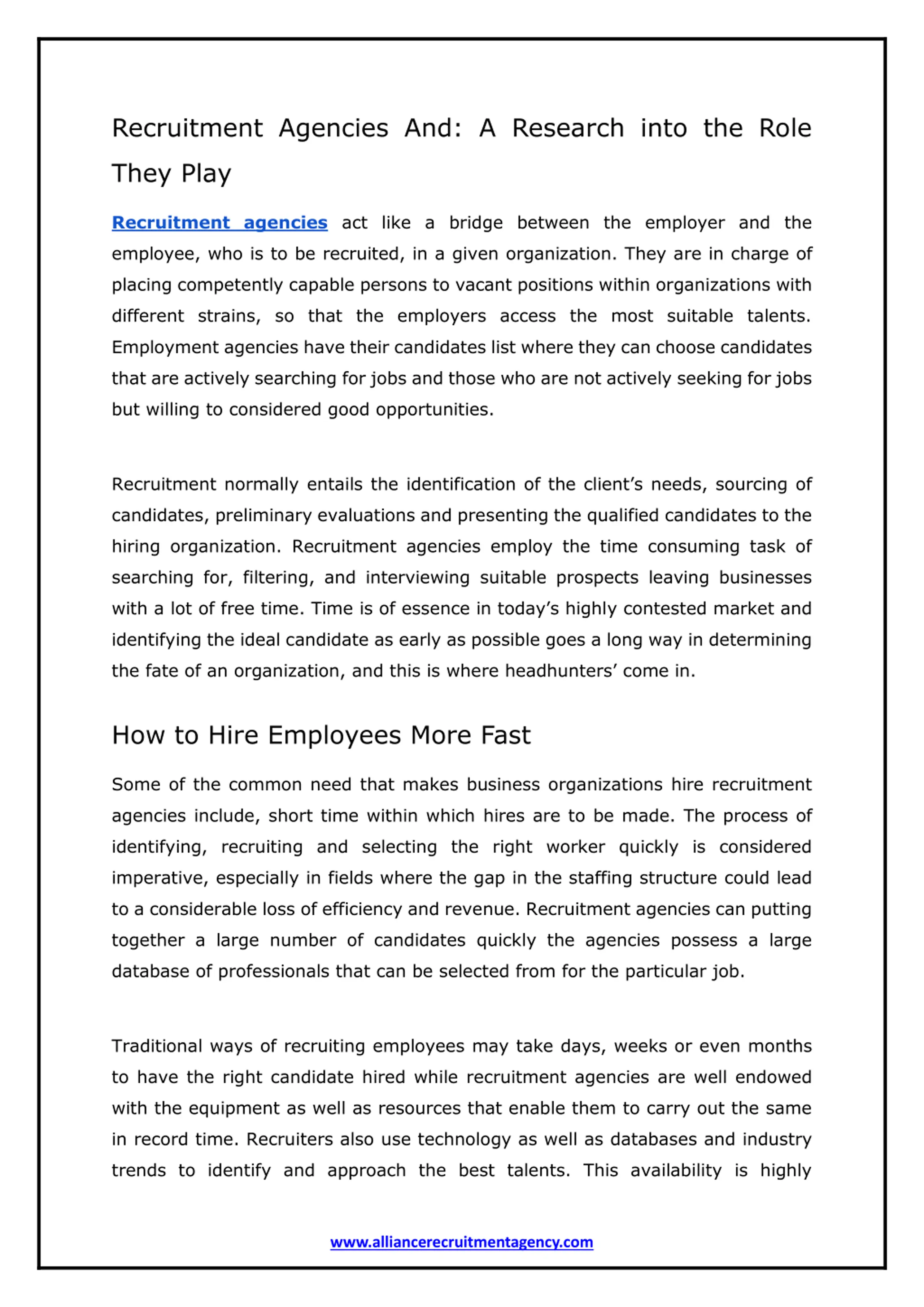 Recruitment Agencies And: A Research into the Role They Play Recruitment agencies act like a bridge between the employer and the employee, who is to be recruited, in a given organization. They are in charge of placing competently capable persons to vacant positions within organizations with different strains, so that the employers access the most suitable talents. Employment agencies have their candidates list where they can choose candidates that are actively searching for jobs and those who are not actively seeking for jobs but willing to considered good opportunities. Recruitment normally entails the identification of the client s needs, sourcing of candidates, preliminary evaluations and presenting the qualified candidates to the hiring organization. Recruitment agencies employ the time consuming task of searching for, filtering, and interviewing suitable prospects leaving businesses with a lot of free time. Time is of essence in today s highly contested market and identifying the ideal candidate as early as possible goes a long way in determining the fate of an organization, and this is where headhunters come in. How to Hire Employees More Fast Some of the common need that makes business organizations hire recruitment agencies include, short time within which hires are to be made. The process of identifying, recruiting and selecting the right worker quickly is considered imperative, especially in fields where the gap in the staffing structure could lead to a considerable loss of efficiency and revenue. Recruitment agencies can putting together a large number of candidates quickly the agencies possess a large database of professionals that can be selected from for the particular job. Traditional ways of recruiting employees may take days, weeks or even months to have the right candidate hired while recruitment agencies are well endowed with the equipment as well as resources that enable them to carry out the same in record time. Recruiters also use technology as well as databases and industry trends to identify and approach the best talents. This availability is highly www.alliancerecruitmentagency.com
