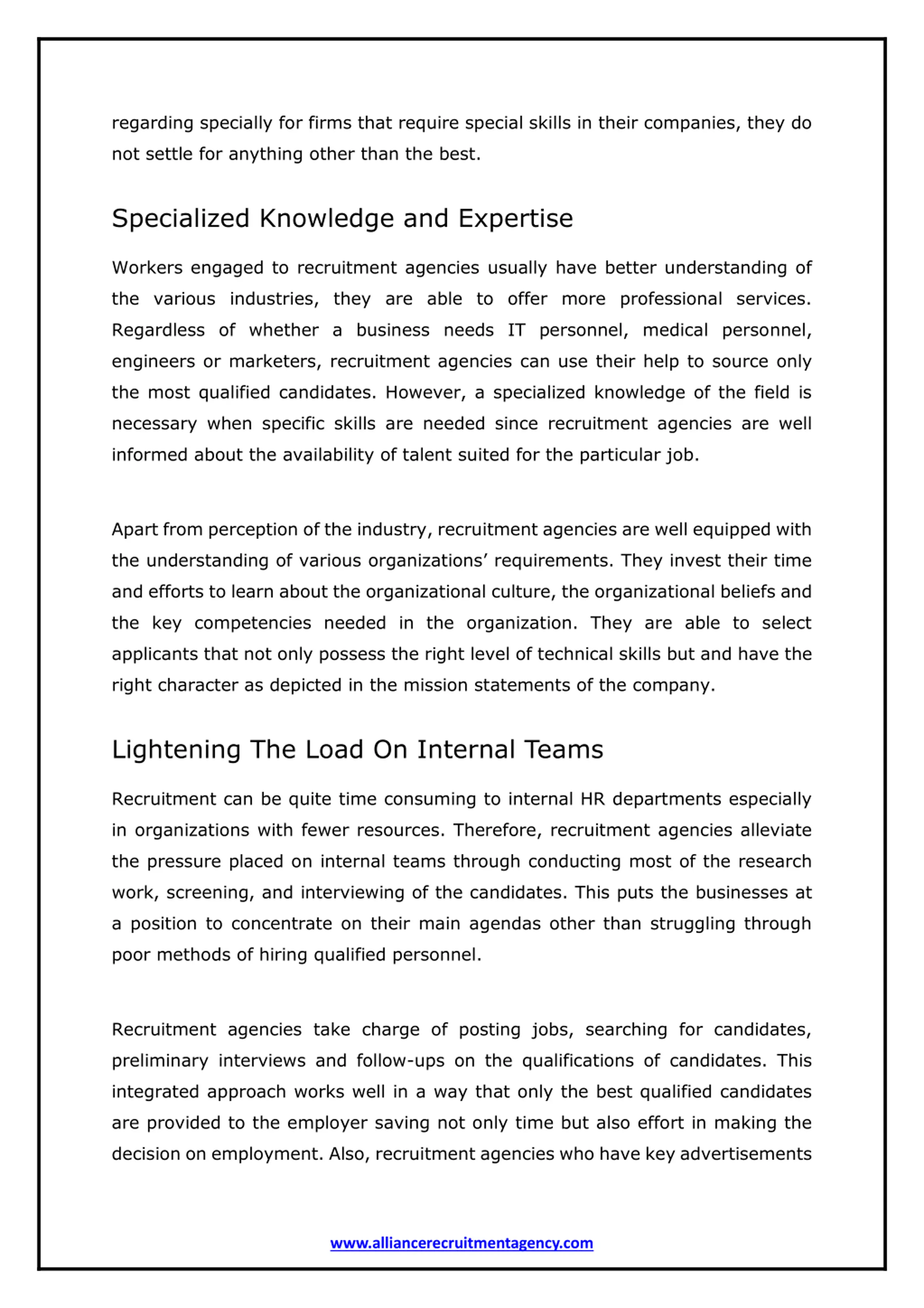regarding specially for firms that require special skills in their companies, they do not settle for anything other than the best. Specialized Knowledge and Expertise Workers engaged to recruitment agencies usually have better understanding of the various industries, they are able to offer more professional services. Regardless of whether a business needs IT personnel, medical personnel, engineers or marketers, recruitment agencies can use their help to source only the most qualified candidates. However, a specialized knowledge of the field is necessary when specific skills are needed since recruitment agencies are well informed about the availability of talent suited for the particular job. Apart from perception of the industry, recruitment agencies are well equipped with the understanding of various organizations requirements. They invest their time and efforts to learn about the organizational culture, the organizational beliefs and the key competencies needed in the organization. They are able to select applicants that not only possess the right level of technical skills but and have the right character as depicted in the mission statements of the company. Lightening The Load On Internal Teams Recruitment can be quite time consuming to internal HR departments especially in organizations with fewer resources. Therefore, recruitment agencies alleviate the pressure placed on internal teams through conducting most of the research work, screening, and interviewing of the candidates. This puts the businesses at a position to concentrate on their main agendas other than struggling through poor methods of hiring qualified personnel. Recruitment agencies take charge of posting jobs, searching for candidates, preliminary interviews and follow-ups on the qualifications of candidates. This integrated approach works well in a way that only the best qualified candidates are provided to the employer saving not only time but also effort in making the decision on employment. Also, recruitment agencies who have key advertisements www.alliancerecruitmentagency.com