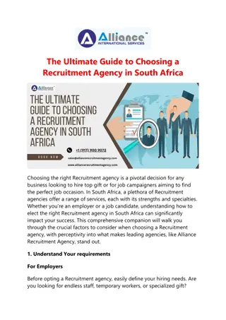 work closely with educational institutions, government bodies, and private organizations to bridge the skills gap and create sustainable employment opportunities. Building Long-Term Partnerships One of the hallmarks of a successful recruitment agency in South Africa is its ability to build long-term partnerships with both clients and candidates. These agencies invest time in understanding the needs and goals of their clients, fostering strong relationships that go beyond transactional interactions. By maintaining ongoing communication and providing continuous support, recruitment agencies become trusted advisors in the hiring process, ensuring long-term success for both employers and employees. Conclusion A recruitment agency in South Africa offers specialized recruitment services that are crucial for navigating the complex and dynamic job market. With their in- depth knowledge of local industries, extensive candidate networks, and comprehensive recruitment solutions, these agencies provide invaluable support to businesses and job seekers alike. Whether it's enhancing employer branding, ensuring compliance with labor laws, or supporting career development, recruitment agencies play a pivotal role in shaping the future of employment in South Africa. Alliance Recruitment Agency: Your Global Manpower Agency Alliance Recruitment Agency: Your Global Manpower Agency offers specialized services to connect businesses with top talent worldwide. As a leading recruitment agency in South Africa, we cater to diverse industries by providing tailored recruitment solutions. Our global manpower agency ensures that we meet the unique needs of our clients, from local enterprises to multinational corporations. www.alliancerecruitmentagency.com