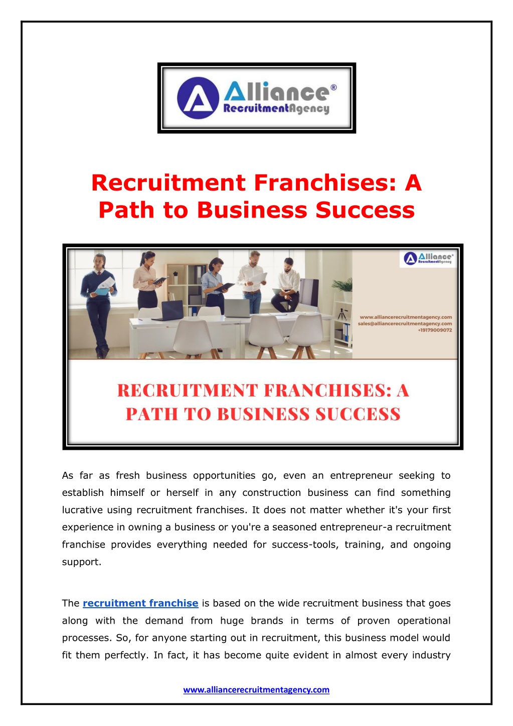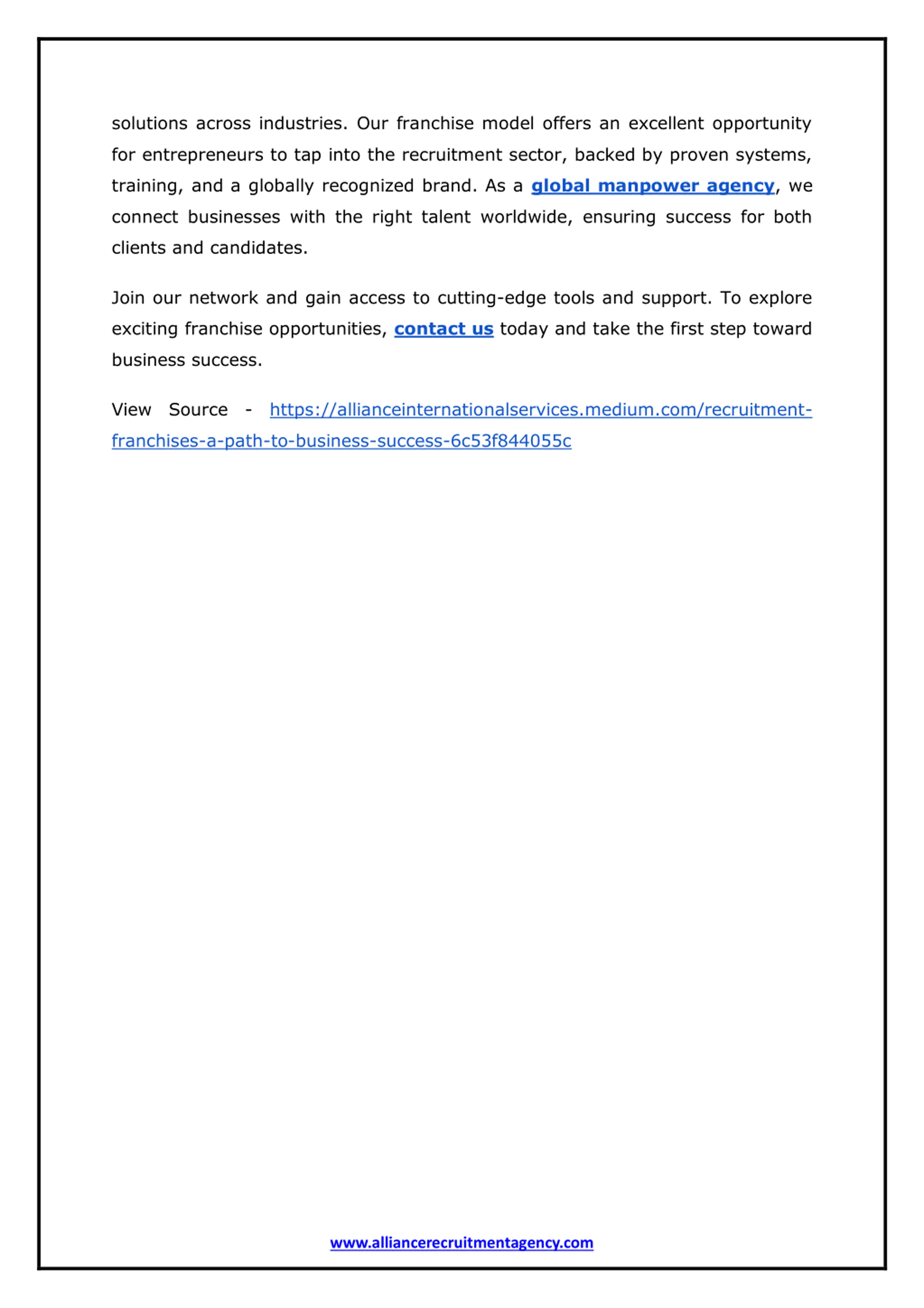 solutions across industries. Our franchise model offers an excellent opportunity for entrepreneurs to tap into the recruitment sector, backed by proven systems, training, and a globally recognized brand. As a global manpower agency, we connect businesses with the right talent worldwide, ensuring success for both clients and candidates. Join our network and gain access to cutting-edge tools and support. To explore exciting franchise opportunities, contact us today and take the first step toward business success. View Source - https://allianceinternationalservices.medium.com/recruitment- franchises-a-path-to-business-success-6c53f844055c www.alliancerecruitmentagency.com