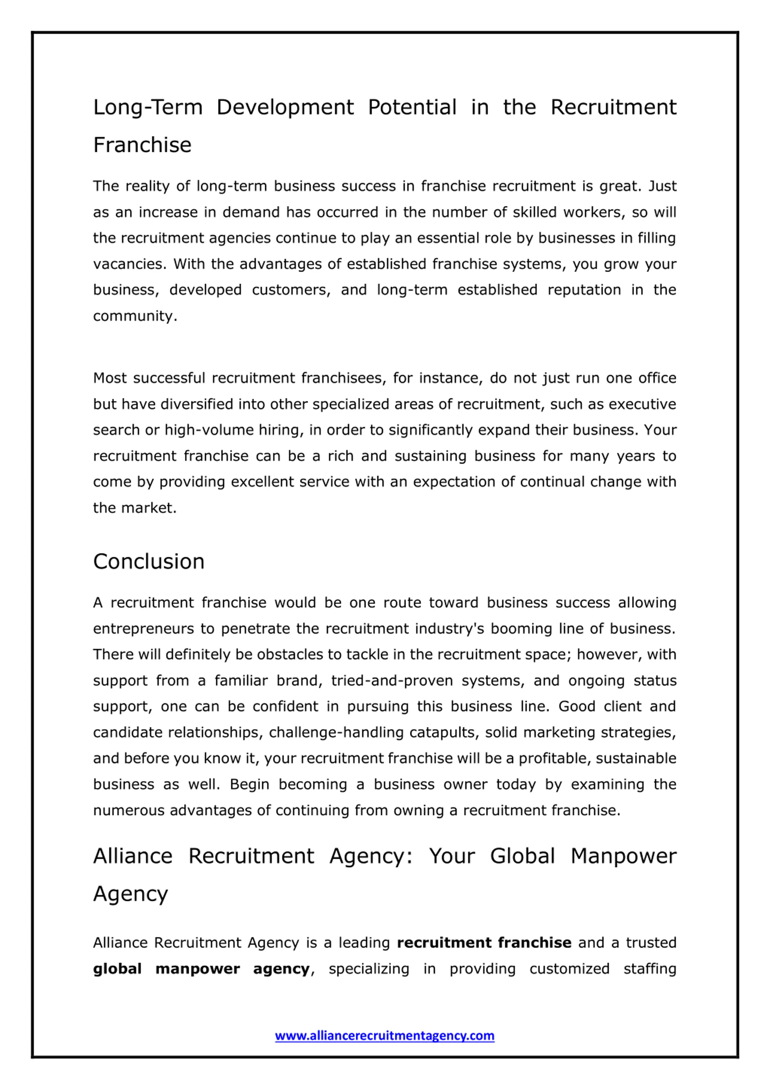Long-Term Development Potential in the Recruitment Franchise The reality of long-term business success in franchise recruitment is great. Just as an increase in demand has occurred in the number of skilled workers, so will the recruitment agencies continue to play an essential role by businesses in filling vacancies. With the advantages of established franchise systems, you grow your business, developed customers, and long-term established reputation in the community. Most successful recruitment franchisees, for instance, do not just run one office but have diversified into other specialized areas of recruitment, such as executive search or high-volume hiring, in order to significantly expand their business. Your recruitment franchise can be a rich and sustaining business for many years to come by providing excellent service with an expectation of continual change with the market. Conclusion A recruitment franchise would be one route toward business success allowing entrepreneurs to penetrate the recruitment industry's booming line of business. There will definitely be obstacles to tackle in the recruitment space; however, with support from a familiar brand, tried-and-proven systems, and ongoing status support, one can be confident in pursuing this business line. Good client and candidate relationships, challenge-handling catapults, solid marketing strategies, and before you know it, your recruitment franchise will be a profitable, sustainable business as well. Begin becoming a business owner today by examining the numerous advantages of continuing from owning a recruitment franchise. Alliance Recruitment Agency: Your Global Manpower Agency Alliance Recruitment Agency is a leading recruitment franchise and a trusted global manpower agency, specializing in providing customized staffing www.alliancerecruitmentagency.com