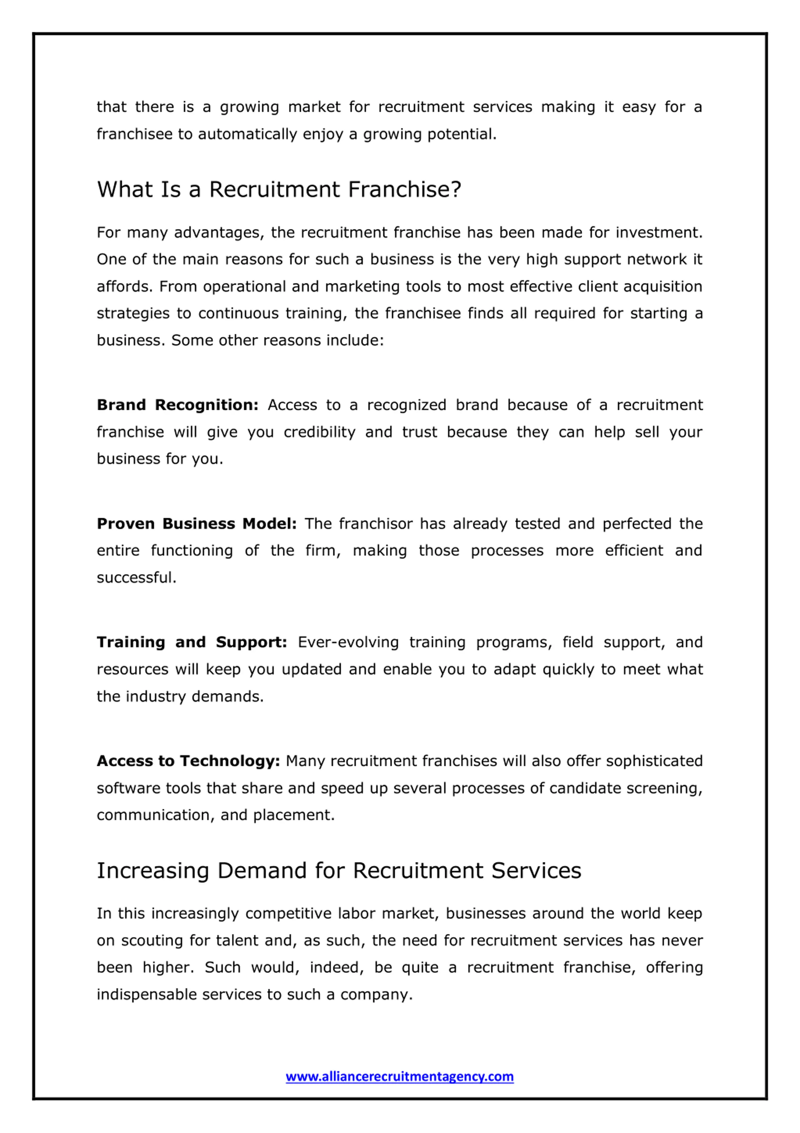 that there is a growing market for recruitment services making it easy for a franchisee to automatically enjoy a growing potential. What Is a Recruitment Franchise? For many advantages, the recruitment franchise has been made for investment. One of the main reasons for such a business is the very high support network it affords. From operational and marketing tools to most effective client acquisition strategies to continuous training, the franchisee finds all required for starting a business. Some other reasons include: Brand Recognition: Access to a recognized brand because of a recruitment franchise will give you credibility and trust because they can help sell your business for you. Proven Business Model: The franchisor has already tested and perfected the entire functioning of the firm, making those processes more efficient and successful. Training and Support: Ever-evolving training programs, field support, and resources will keep you updated and enable you to adapt quickly to meet what the industry demands. Access to Technology: Many recruitment franchises will also offer sophisticated software tools that share and speed up several processes of candidate screening, communication, and placement. Increasing Demand for Recruitment Services In this increasingly competitive labor market, businesses around the world keep on scouting for talent and, as such, the need for recruitment services has never been higher. Such would, indeed, be quite a recruitment franchise, offering indispensable services to such a company. www.alliancerecruitmentagency.com