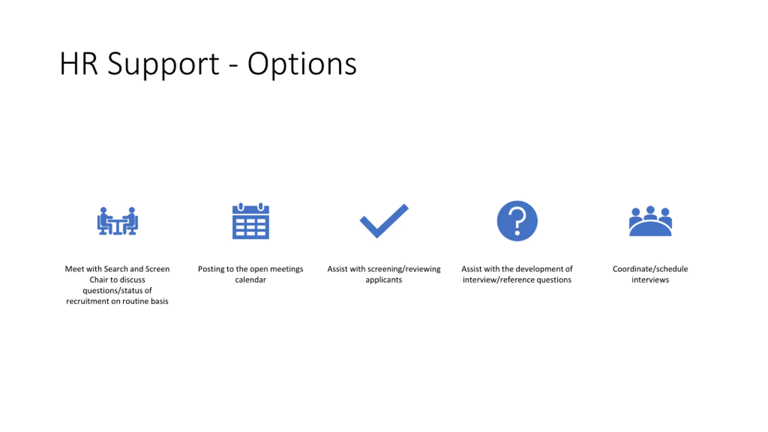 HR Support - Options Meet with Search and Screen Chair to discuss questions/status of recruitment on routine basis Posting to the open meetings calendar Assist with screening/reviewing applicants Assist with the development of interview/reference questions Coordinate/schedule interviews