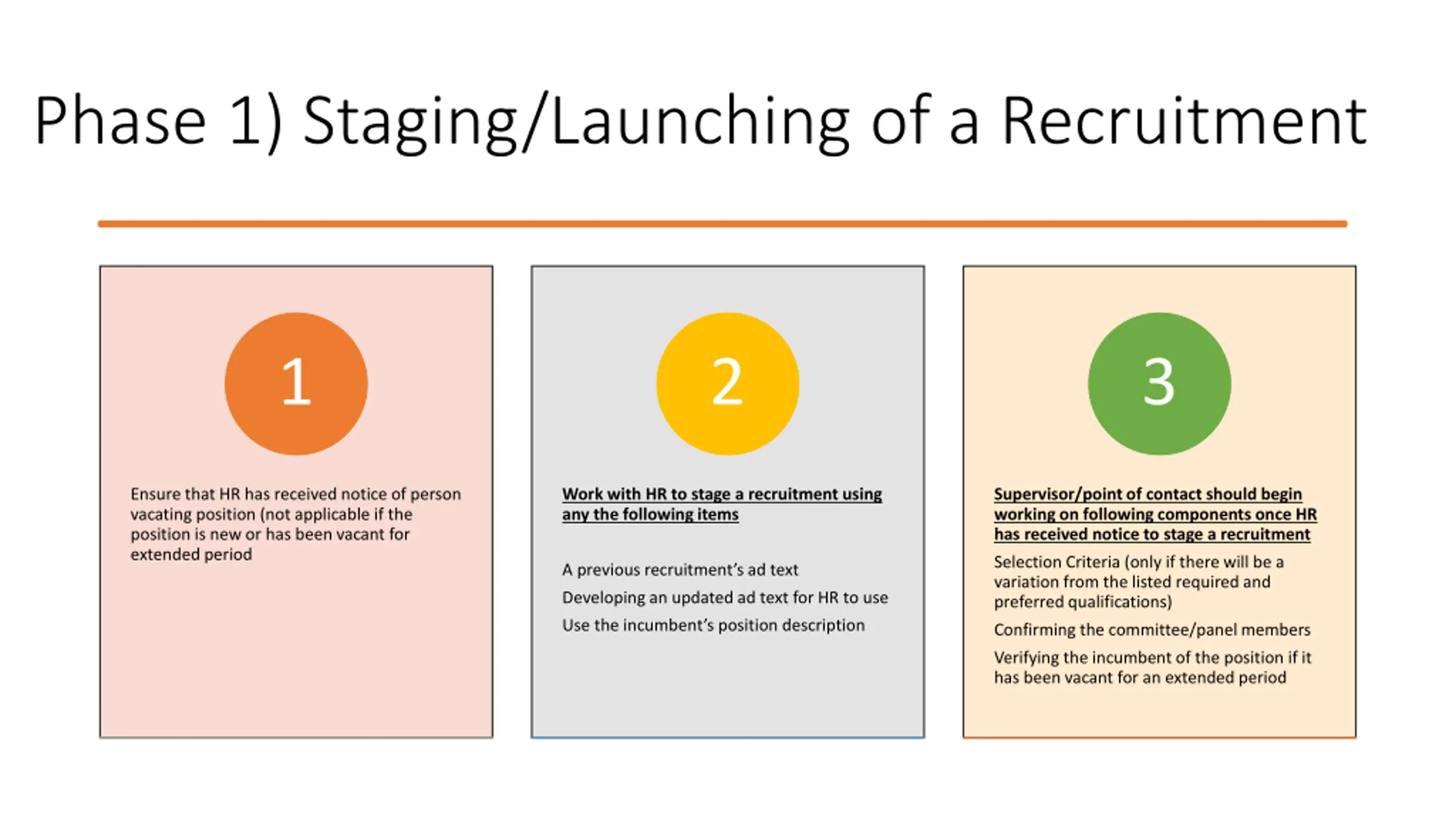 Phase 1) Staging/Launching of a Recruitment 1 2 3 Ensure that HR has received notice of person vacating position (not applicable if the position is new or has been vacant for extended period Work with HR to stage a recruitment using any the following items Supervisor/point of contact should begin working on following components once HR has received notice to stage a recruitment Selection Criteria (only if there will be a variation from the listed required and preferred qualifications) A previous recruitment s ad text Developing an updated ad text for HR to use Use the incumbent s position description Confirming the committee/panel members Verifying the incumbent of the position if it has been vacant for an extended period
