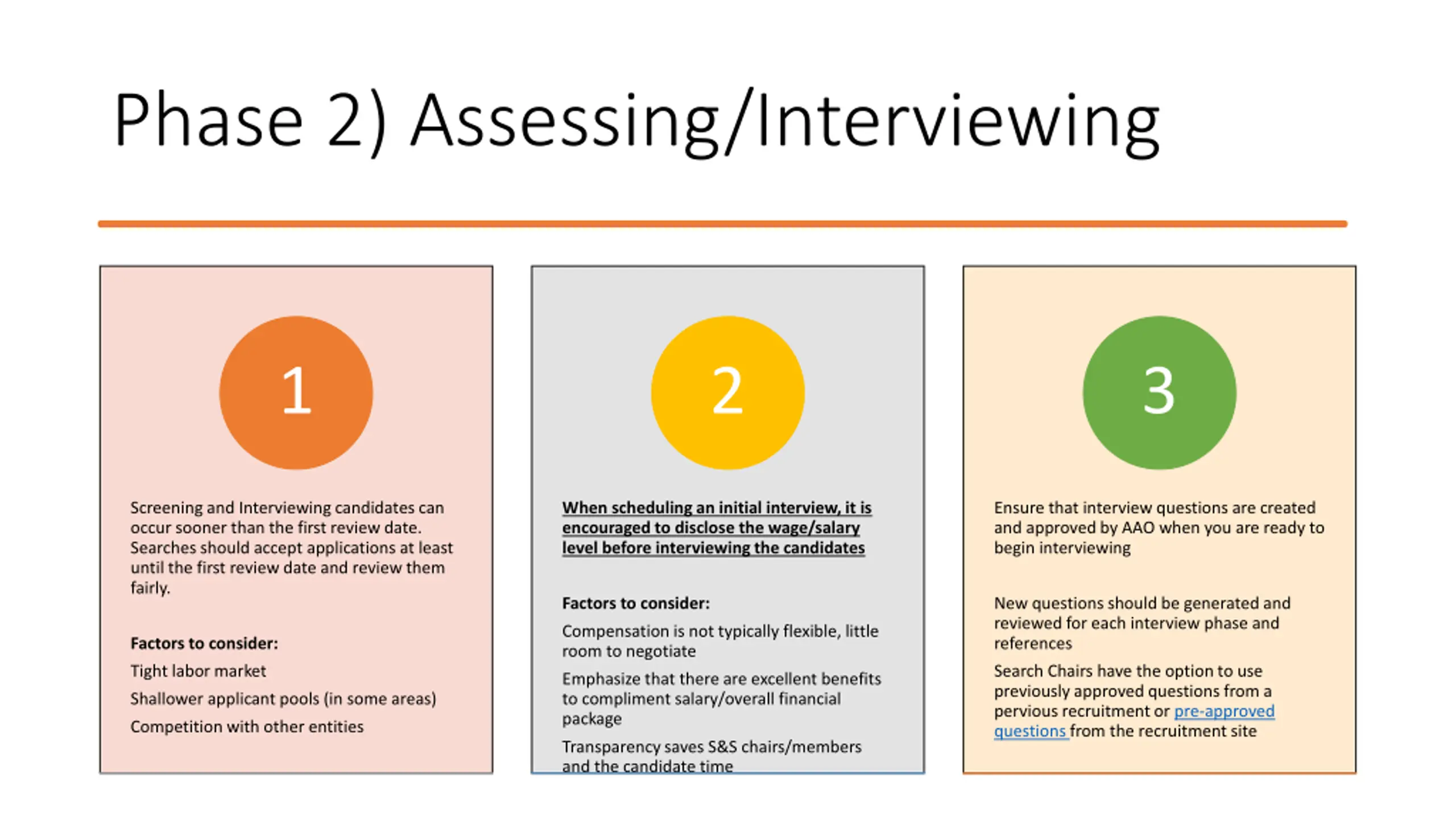 Phase 2) Assessing/Interviewing 1 2 3 Screening and Interviewing candidates can occur sooner than the first review date. Searches should accept applications at least until the first review date and review them fairly. When scheduling an initial interview, it is encouraged to disclose the wage/salary level before interviewing the candidates Ensure that interview questions are created and approved by AAO when you are ready to begin interviewing Factors to consider: New questions should be generated and reviewed for each interview phase and references Compensation is not typically flexible, little room to negotiate Factors to consider: Tight labor market Search Chairs have the option to use previously approved questions from a Emphasize that there are excellent benefits to compliment salary/overall financial package Shallower applicant pools (in some areas) pre-approved questions pre-approved questions pervious recruitment or pre-approved questions from the recruitment site Competition with other entities Transparency saves S&S chairs/members and the candidate time