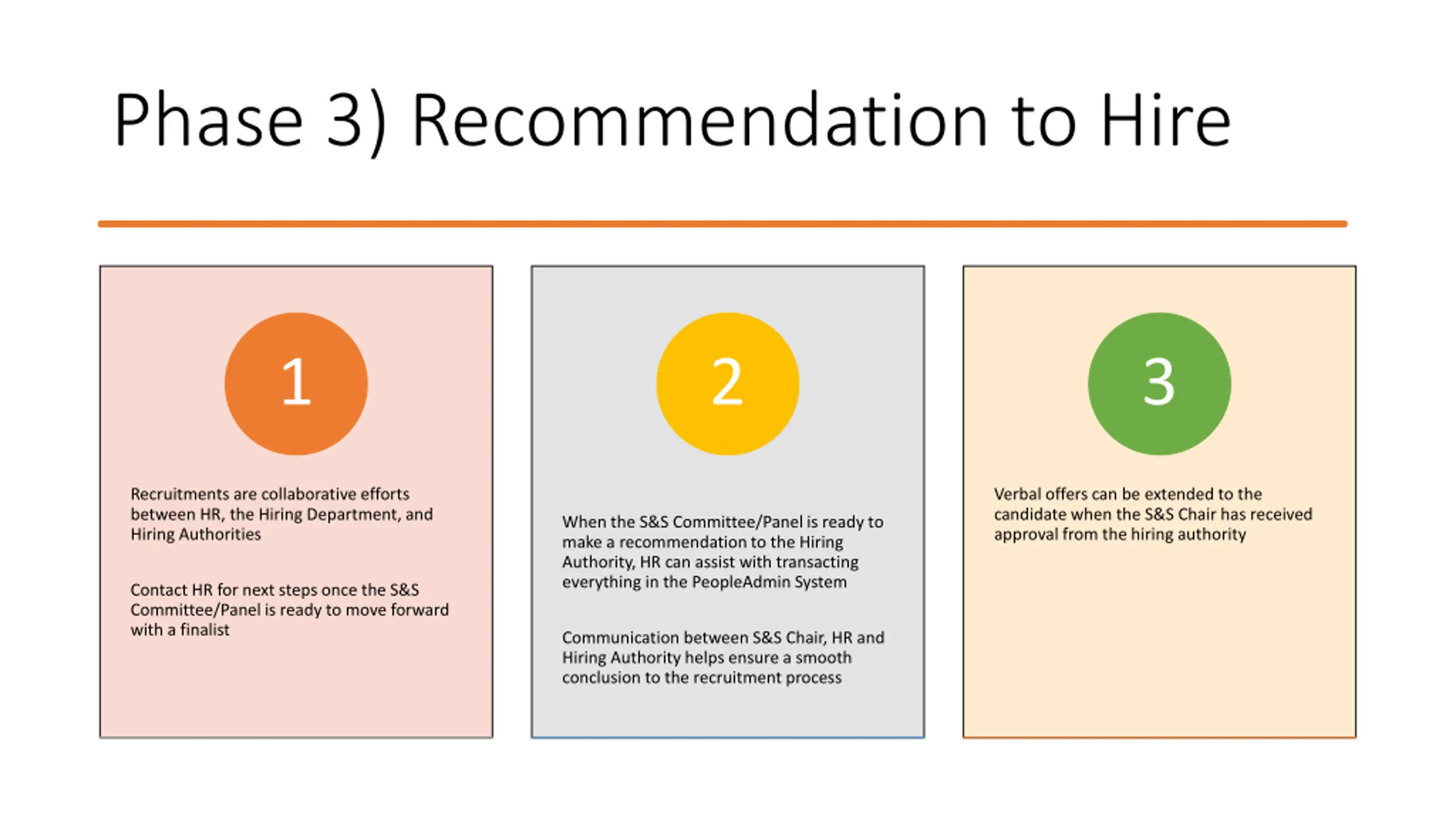 Phase 3) Recommendation to Hire 1 2 3 Recruitments are collaborative efforts between HR, the Hiring Department, and Hiring Authorities Verbal offers can be extended to the candidate when the S&S Chair has received approval from the hiring authority When the S&S Committee/Panel is ready to make a recommendation to the Hiring Authority, HR can assist with transacting everything in the PeopleAdmin System Contact HR for next steps once the S&S Committee/Panel is ready to move forward with a finalist Communication between S&S Chair, HR and Hiring Authority helps ensure a smooth conclusion to the recruitment process