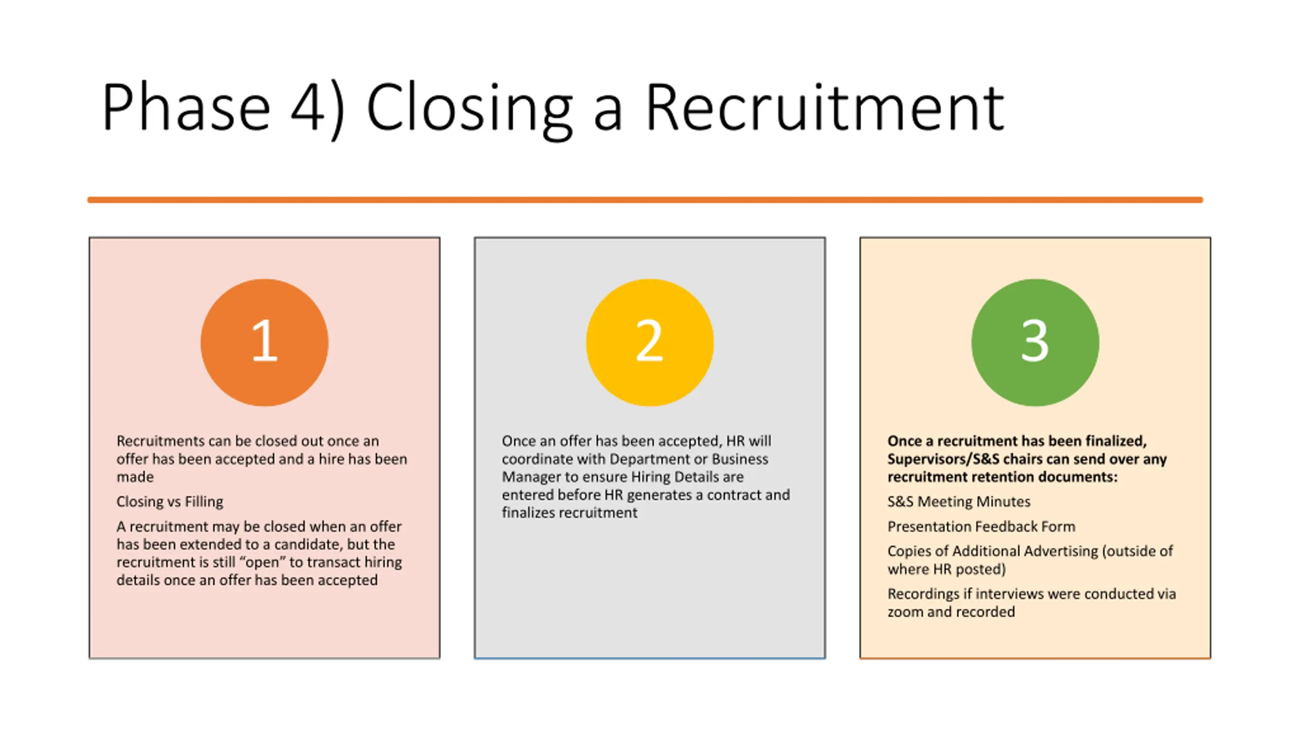 Phase 4) Closing a Recruitment 1 2 3 Recruitments can be closed out once an offer has been accepted and a hire has been made Once an offer has been accepted, HR will coordinate with Department or Business Manager to ensure Hiring Details are entered before HR generates a contract and finalizes recruitment Once a recruitment has been finalized, Supervisors/S&S chairs can send over any recruitment retention documents: Closing vs Filling S&S Meeting Minutes A recruitment may be closed when an offer has been extended to a candidate, but the recruitment is still open to transact hiring details once an offer has been accepted Presentation Feedback Form Copies of Additional Advertising (outside of where HR posted) Recordings if interviews were conducted via zoom and recorded