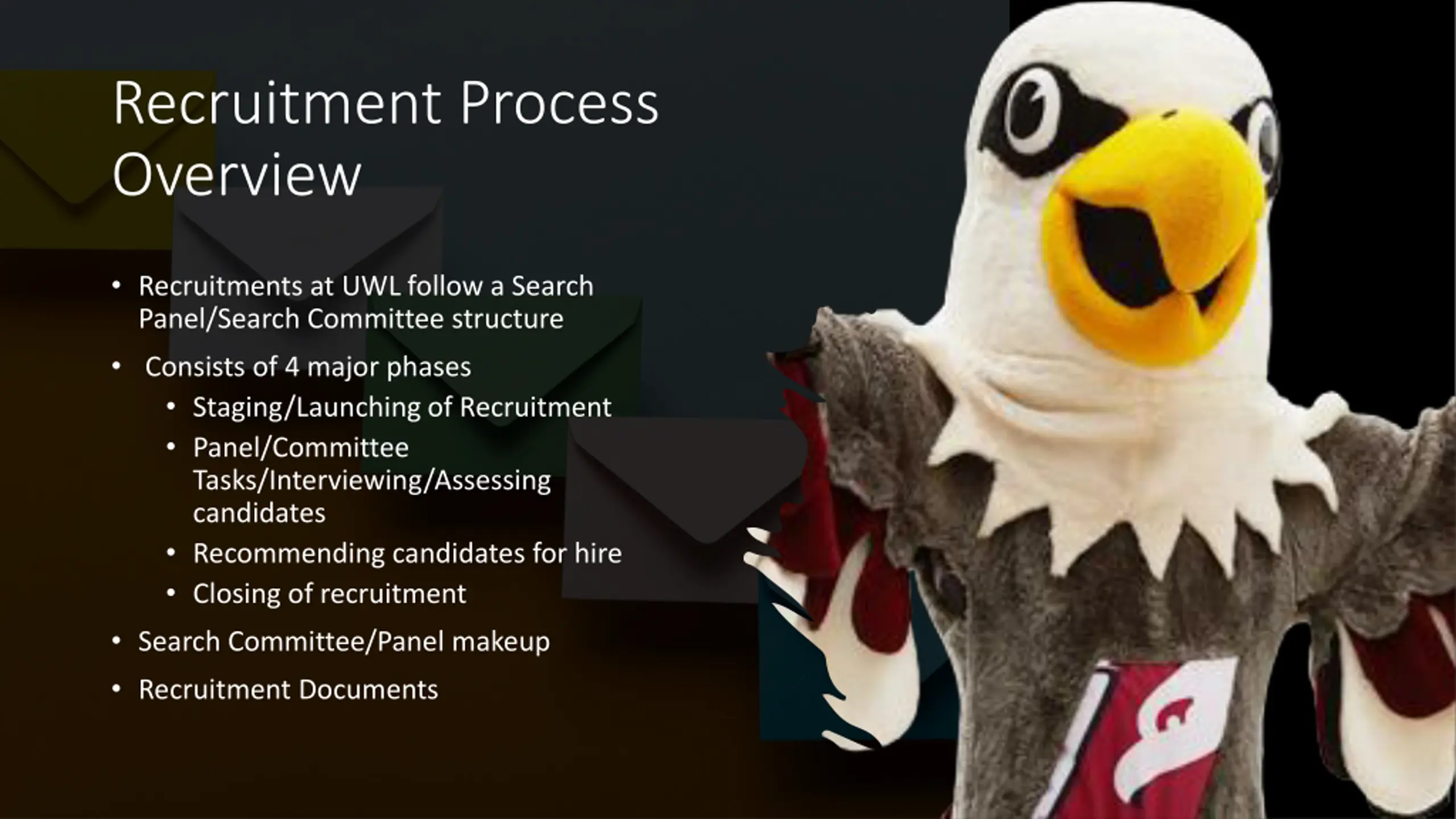 Recruitment Process Overview Recruitments at UWL follow a Search Panel/Search Committee structure Consists of 4 major phases Staging/Launching of Recruitment Panel/Committee Tasks/Interviewing/Assessing candidates Recommending candidates for hire Closing of recruitment Search Committee/Panel makeup Recruitment Documents