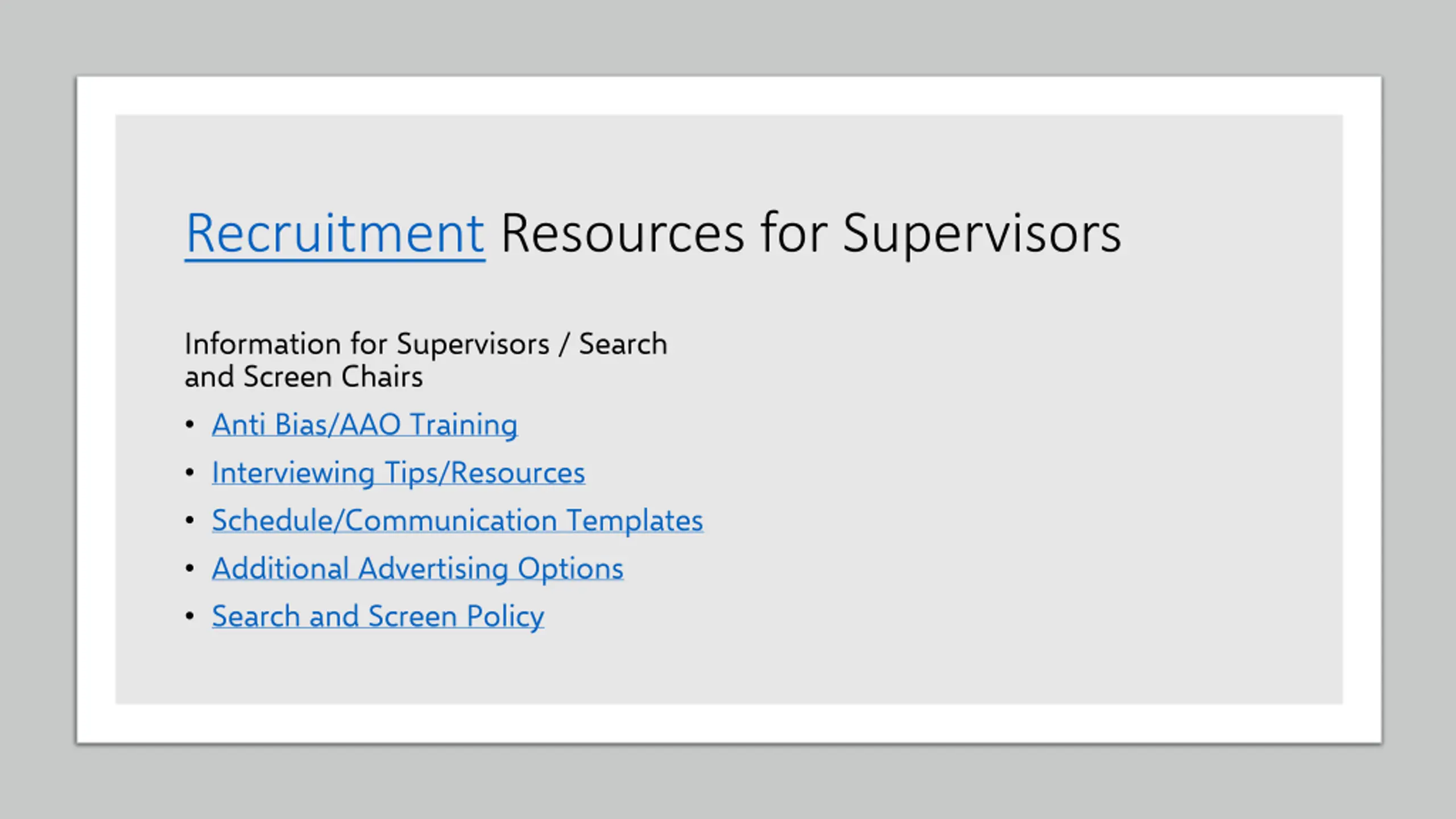 Recruitment Resources for Supervisors Information for Supervisors / Search and Screen Chairs Anti Bias/AAO Training Interviewing Tips/Resources Schedule/Communication Templates Additional Advertising Options Search and Screen Policy