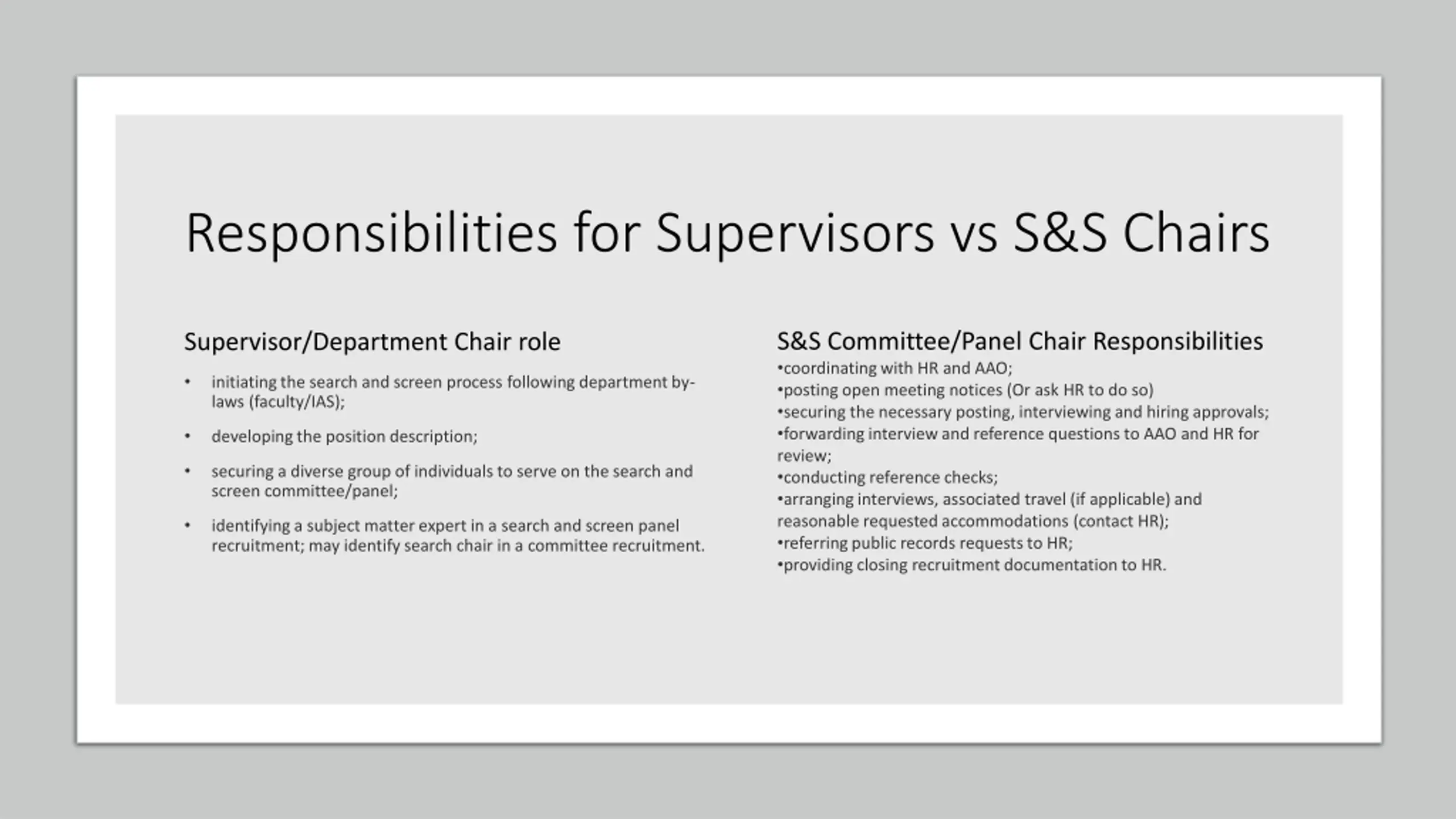 Responsibilities for Supervisors vs S&S Chairs S&S Committee/Panel Chair Responsibilities coordinating with HR and AAO; posting open meeting notices (Or ask HR to do so) securing the necessary posting, interviewing and hiring approvals; forwarding interview and reference questions to AAO and HR for review; conducting reference checks; arranging interviews, associated travel (if applicable) and reasonable requested accommodations (contact HR); referring public records requests to HR; providing closing recruitment documentation to HR. Supervisor/Department Chair role initiating the search and screen process following department by- laws (faculty/IAS); developing the position description; securing a diverse group of individuals to serve on the search and screen committee/panel; identifying a subject matter expert in a search and screen panel recruitment; may identify search chair in a committee recruitment.