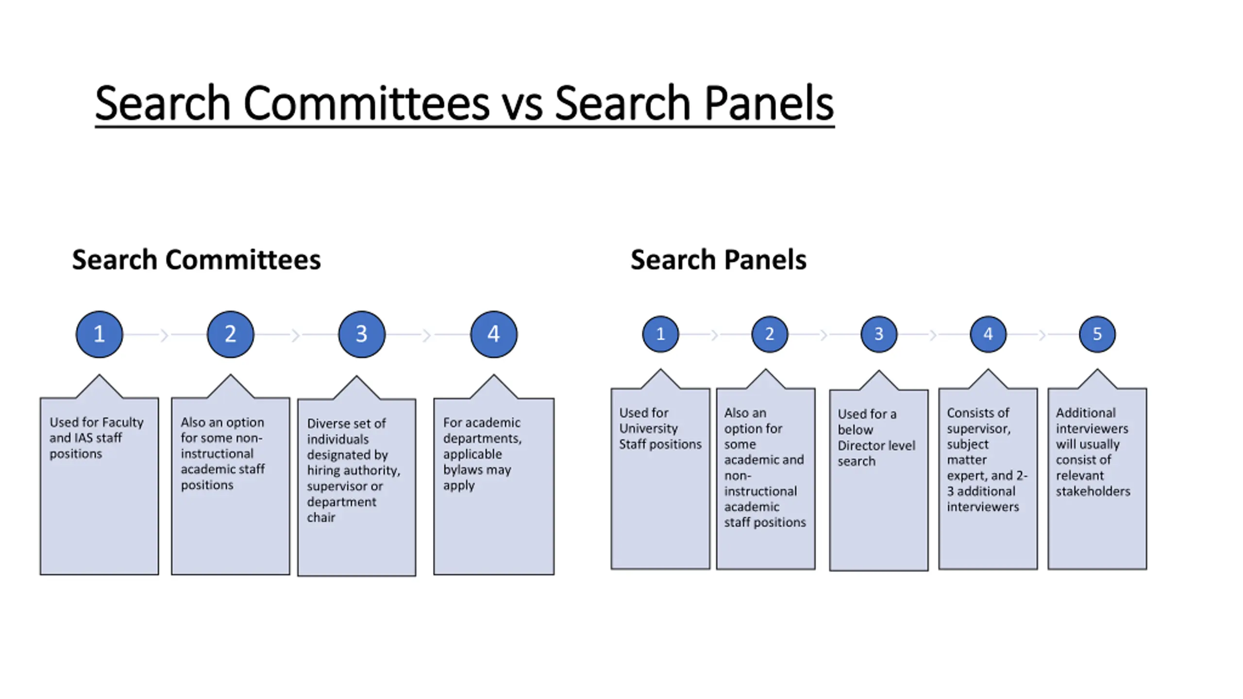 Search Committees vs Search Panels Search Committees vs Search Panels Search Committees Search Panels 2 3 4 1 1 2 3 4 5 Used for University Staff positions Also an option for some academic and non- instructional academic staff positions Consists of supervisor, subject matter expert, and 2- 3 additional interviewers Additional interviewers will usually consist of relevant stakeholders Used for a below Director level search Also an option for some non- instructional academic staff positions Used for Faculty and IAS staff positions For academic departments, applicable bylaws may apply Diverse set of individuals designated by hiring authority, supervisor or department chair