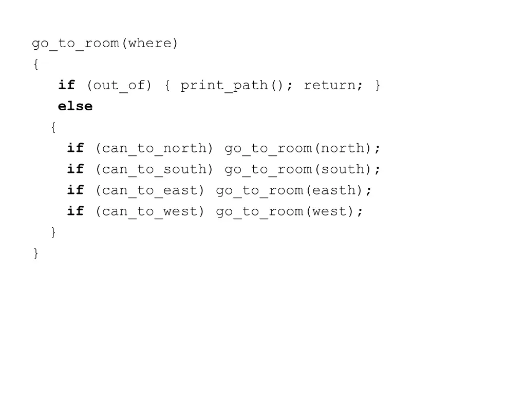 go_to_room(where) { if (out_of) { print_path(); return; } else { if (can_to_north) go_to_room(north); if (can_to_south) go_to_room(south); if (can_to_east) go_to_room(easth); if (can_to_west) go_to_room(west); } }