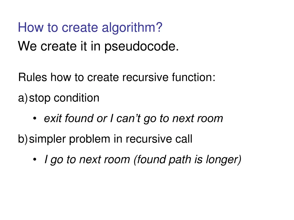 How to create algorithm? We create it in pseudocode. Rules how to create recursive function: a)stop condition exit found or I can t go to next room b)simpler problem in recursive call I go to next room (found path is longer)