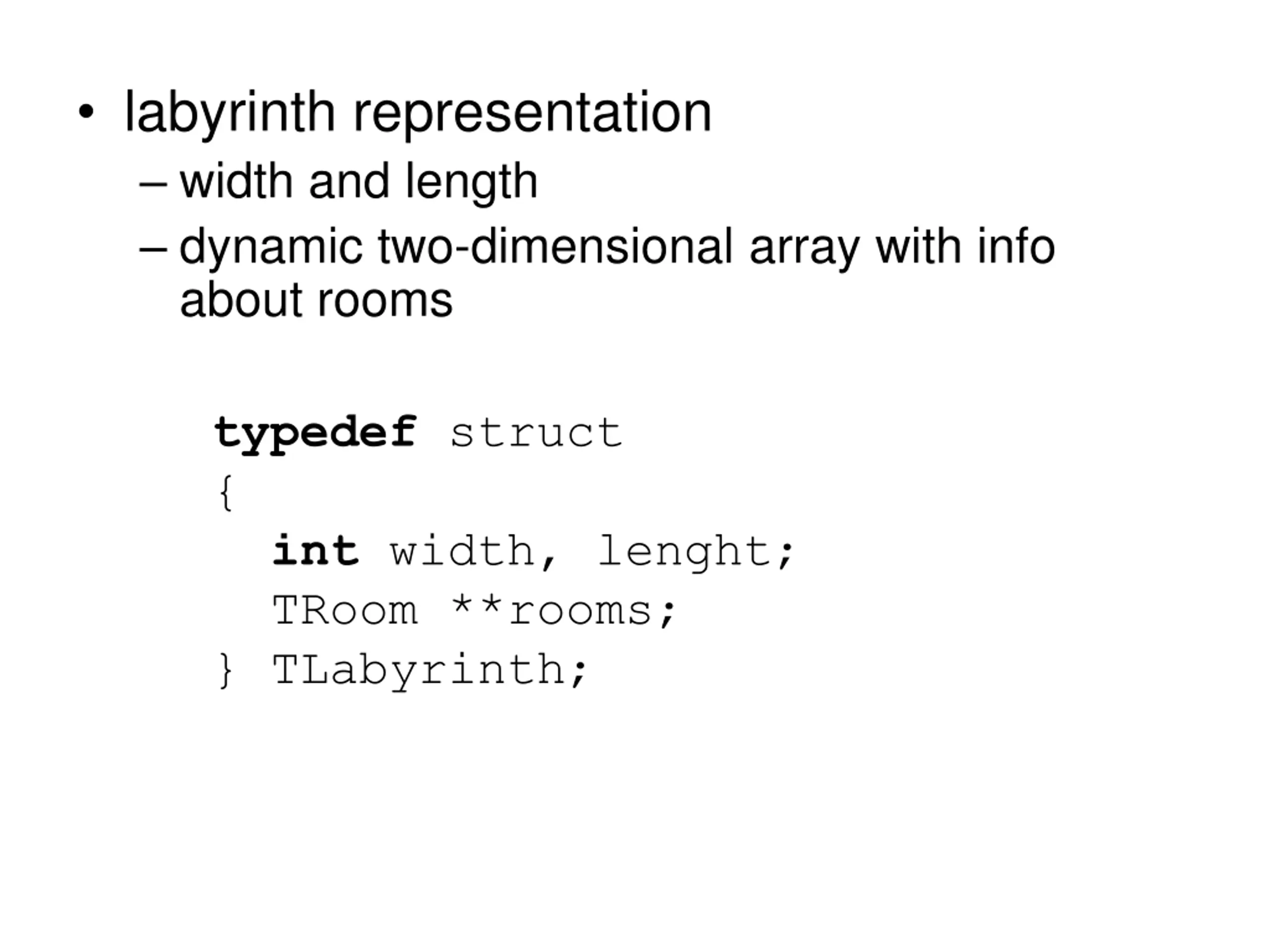 labyrinth representation width and length dynamic two-dimensional array with info about rooms typedef struct { int width, lenght; TRoom **rooms; } TLabyrinth;