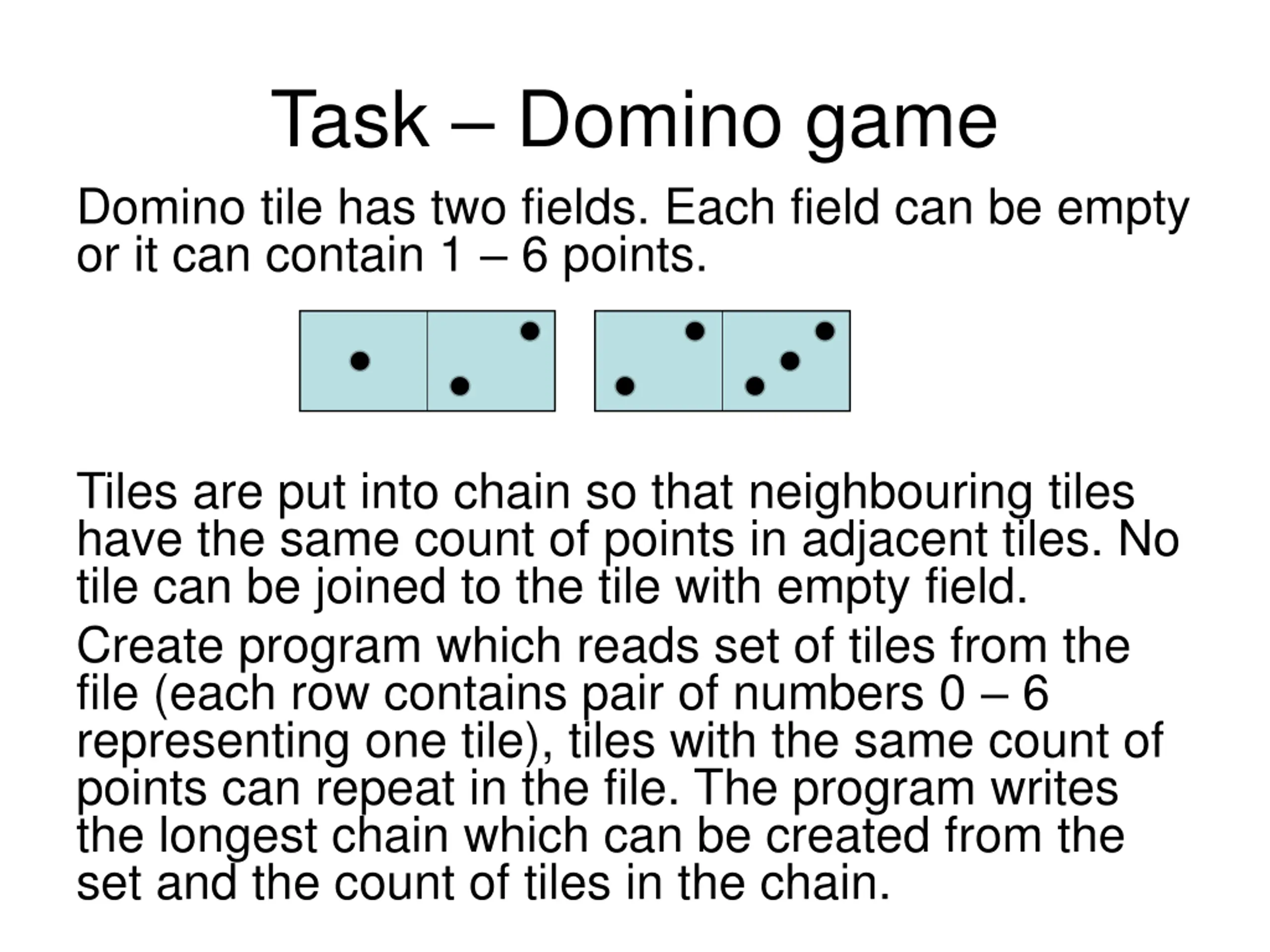 Task Domino game Domino tile has two fields. Each field can be empty or it can contain 1 6 points. Tiles are put into chain so that neighbouring tiles have the same count of points in adjacent tiles. No tile can be joined to the tile with empty field. Create program which reads set of tiles from the file (each row contains pair of numbers 0 6 representing one tile), tiles with the same count of points can repeat in the file. The program writes the longest chain which can be created from the set and the count of tiles in the chain.