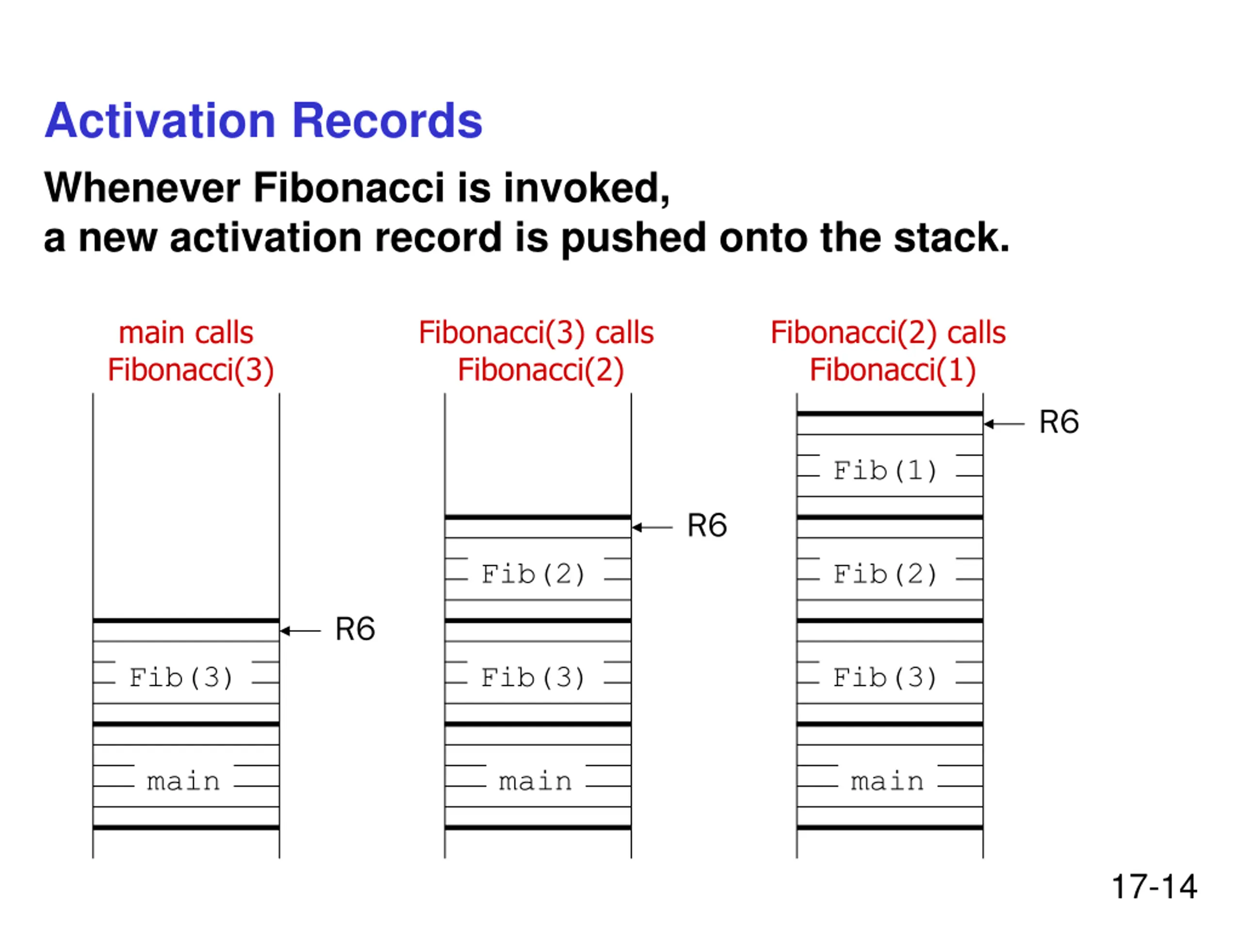 Activation Records Whenever Fibonacci is invoked, a new activation record is pushed onto the stack. main calls Fibonacci(3) Fibonacci(3) calls Fibonacci(2) Fibonacci(2) calls Fibonacci(1) R6 Fib(1) R6 Fib(2) Fib(2) R6 Fib(3) Fib(3) Fib(3) main main main 17-14