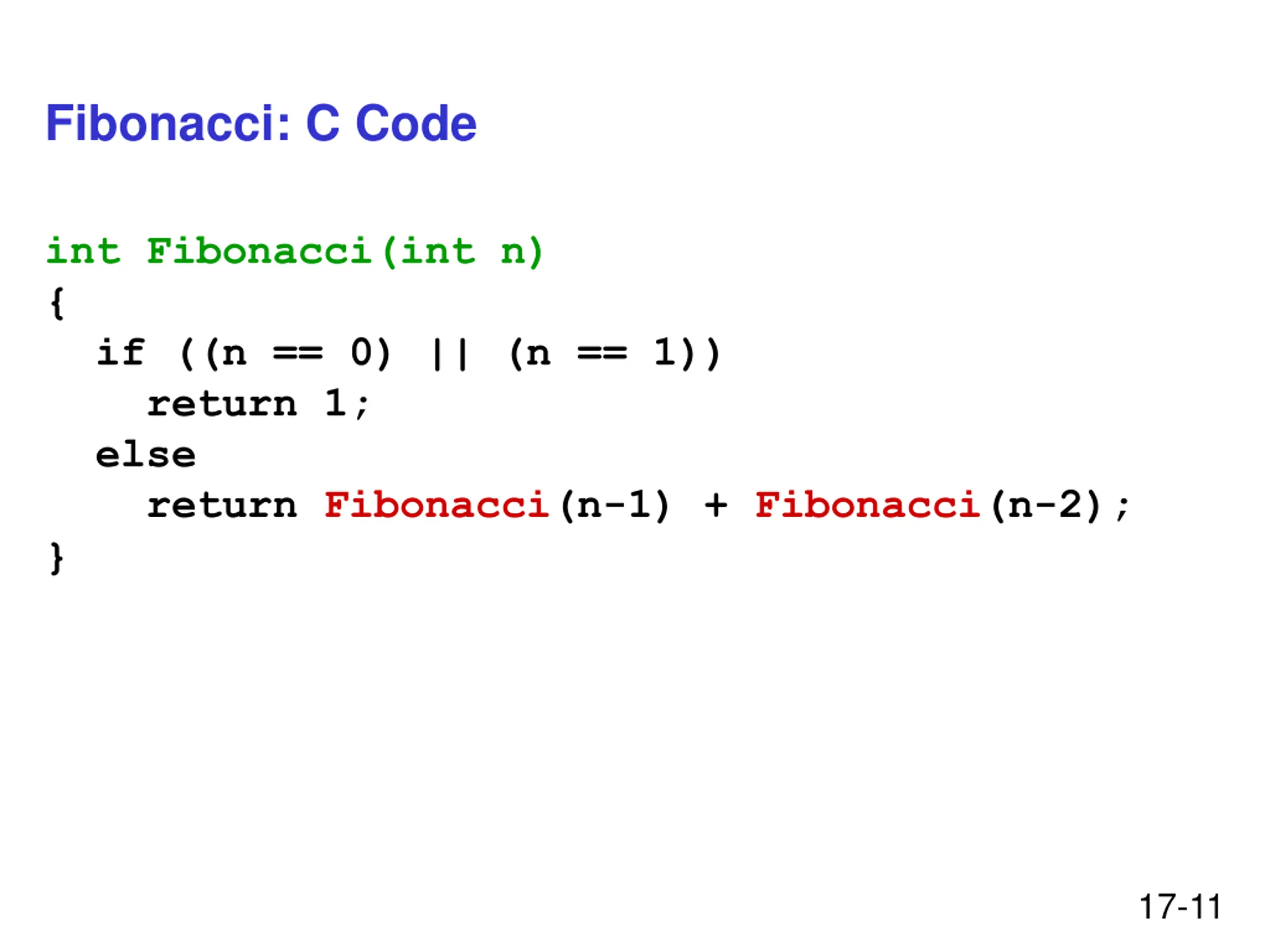 Fibonacci: C Code int Fibonacci(int n) { if ((n == 0) || (n == 1)) return 1; else return Fibonacci(n-1) + Fibonacci(n-2); } 17-11