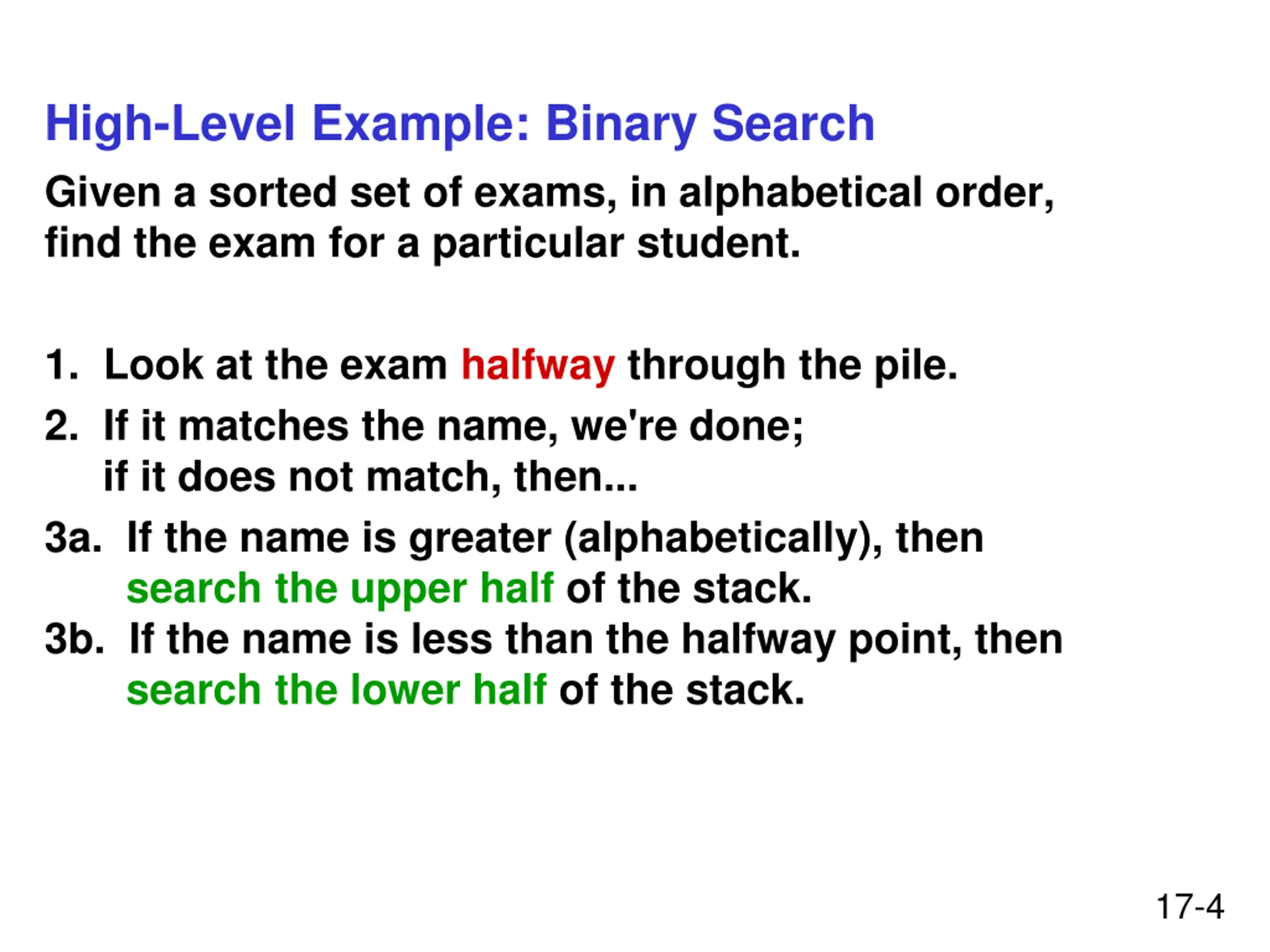 High-Level Example: Binary Search Given a sorted set of exams, in alphabetical order, find the exam for a particular student. 1. Look at the exam halfway through the pile. 2. If it matches the name, we're done; if it does not match, then... 3a. If the name is greater (alphabetically), then search the upper half of the stack. 3b. If the name is less than the halfway point, then search the lower half of the stack. 17-4