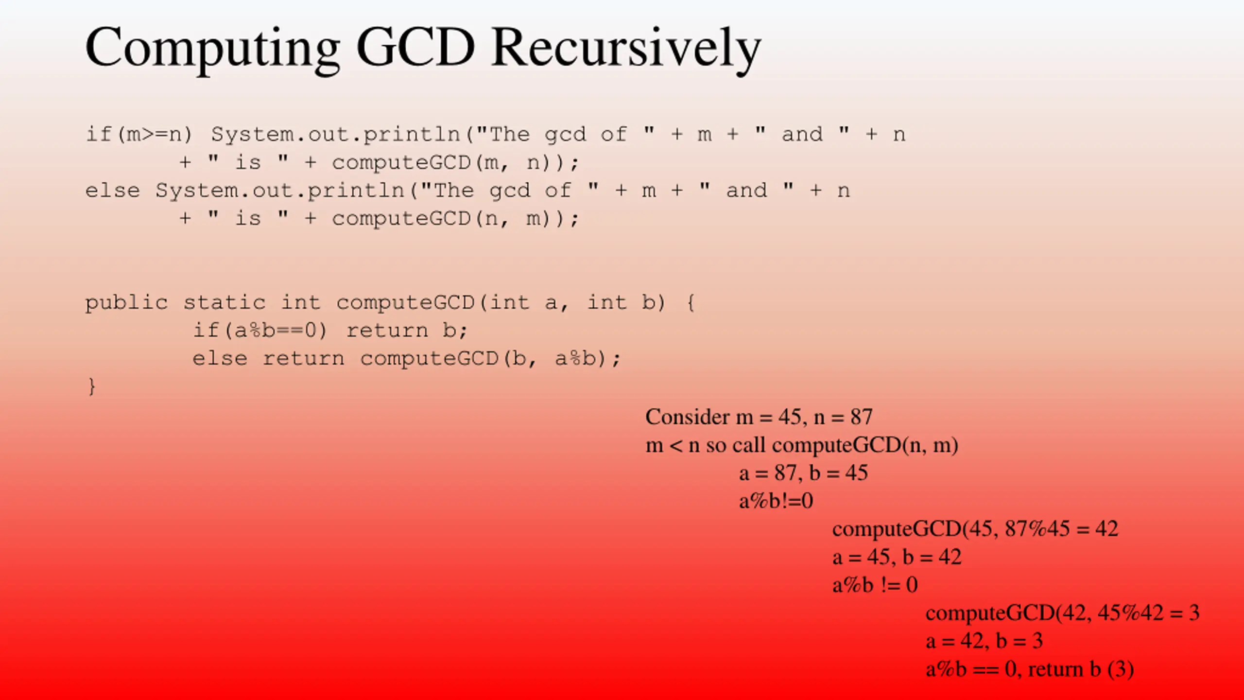 Computing GCD Recursively if(m>=n) System.out.println("The gcd of " + m + " and " + n + " is " + computeGCD(m, n)); else System.out.println("The gcd of " + m + " and " + n + " is " + computeGCD(n, m)); public static int computeGCD(int a, int b) { if(a%b==0) return b; else return computeGCD(b, a%b); } Consider m = 45, n = 87 m < n so call computeGCD(n, m) a = 87, b = 45 a%b!=0 computeGCD(45, 87%45 = 42 a = 45, b = 42 a%b != 0 computeGCD(42, 45%42 = 3 a = 42, b = 3 a%b == 0, return b (3)