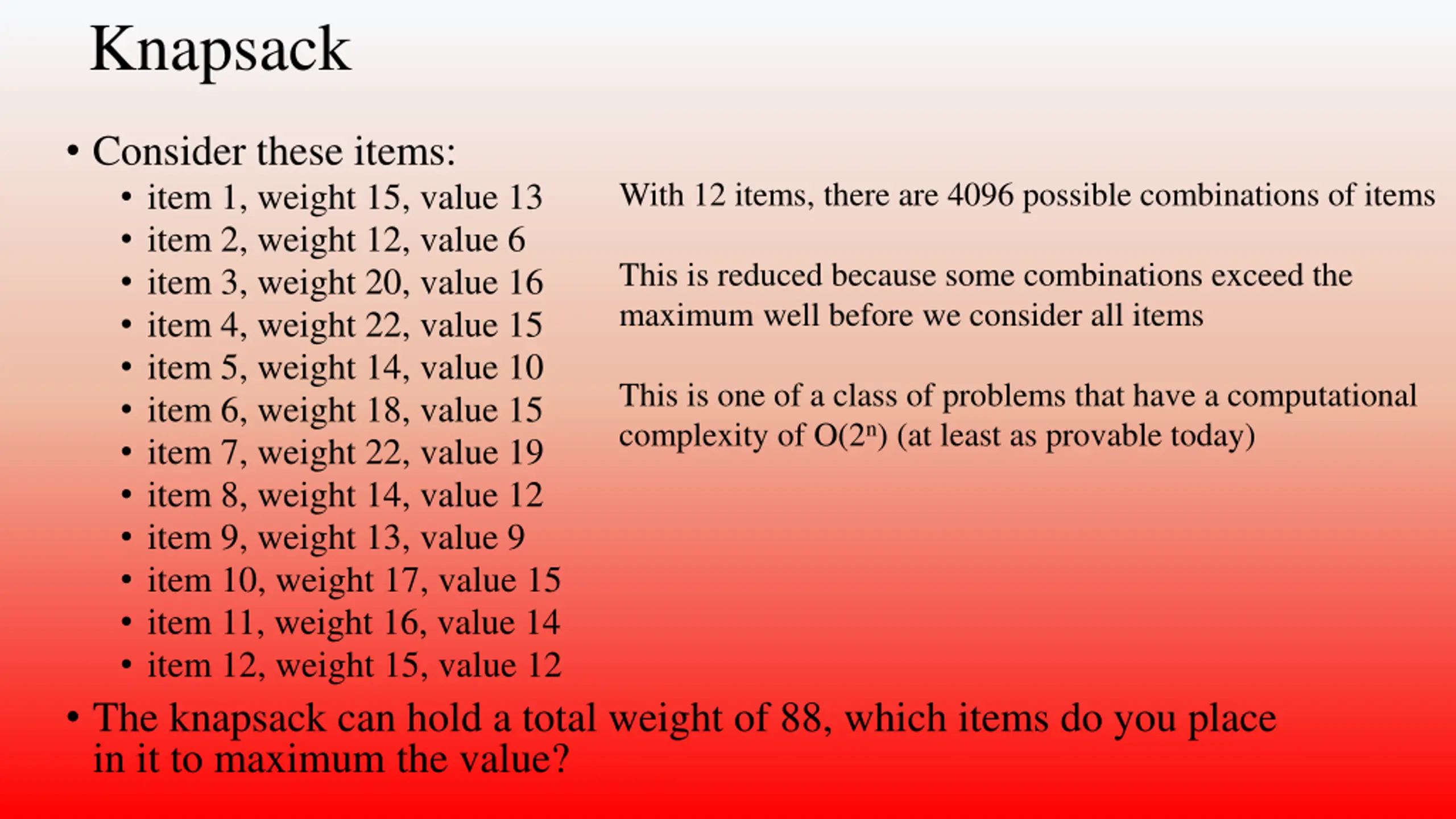 Knapsack Consider these items: item 1, weight 15, value 13 item 2, weight 12, value 6 item 3, weight 20, value 16 item 4, weight 22, value 15 item 5, weight 14, value 10 item 6, weight 18, value 15 item 7, weight 22, value 19 item 8, weight 14, value 12 item 9, weight 13, value 9 item 10, weight 17, value 15 item 11, weight 16, value 14 item 12, weight 15, value 12 The knapsack can hold a total weight of 88, which items do you place in it to maximum the value? With 12 items, there are 4096 possible combinations of items This is reduced because some combinations exceed the maximum well before we consider all items This is one of a class of problems that have a computational complexity of O(2n) (at least as provable today)