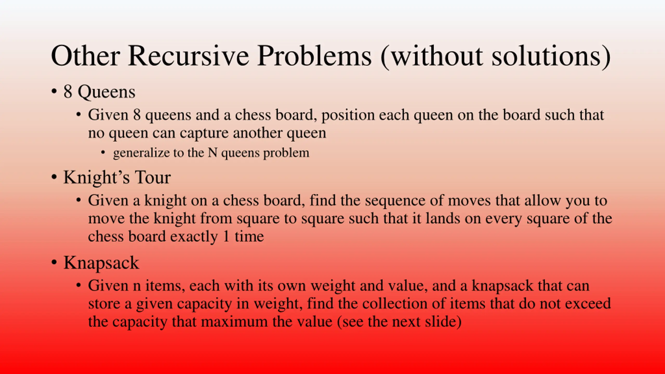 Other Recursive Problems (without solutions) 8 Queens Given 8 queens and a chess board, position each queen on the board such that no queen can capture another queen generalize to the N queens problem Knight s Tour Given a knight on a chess board, find the sequence of moves that allow you to move the knight from square to square such that it lands on every square of the chess board exactly 1 time Knapsack Given n items, each with its own weight and value, and a knapsack that can store a given capacity in weight, find the collection of items that do not exceed the capacity that maximum the value (see the next slide)
