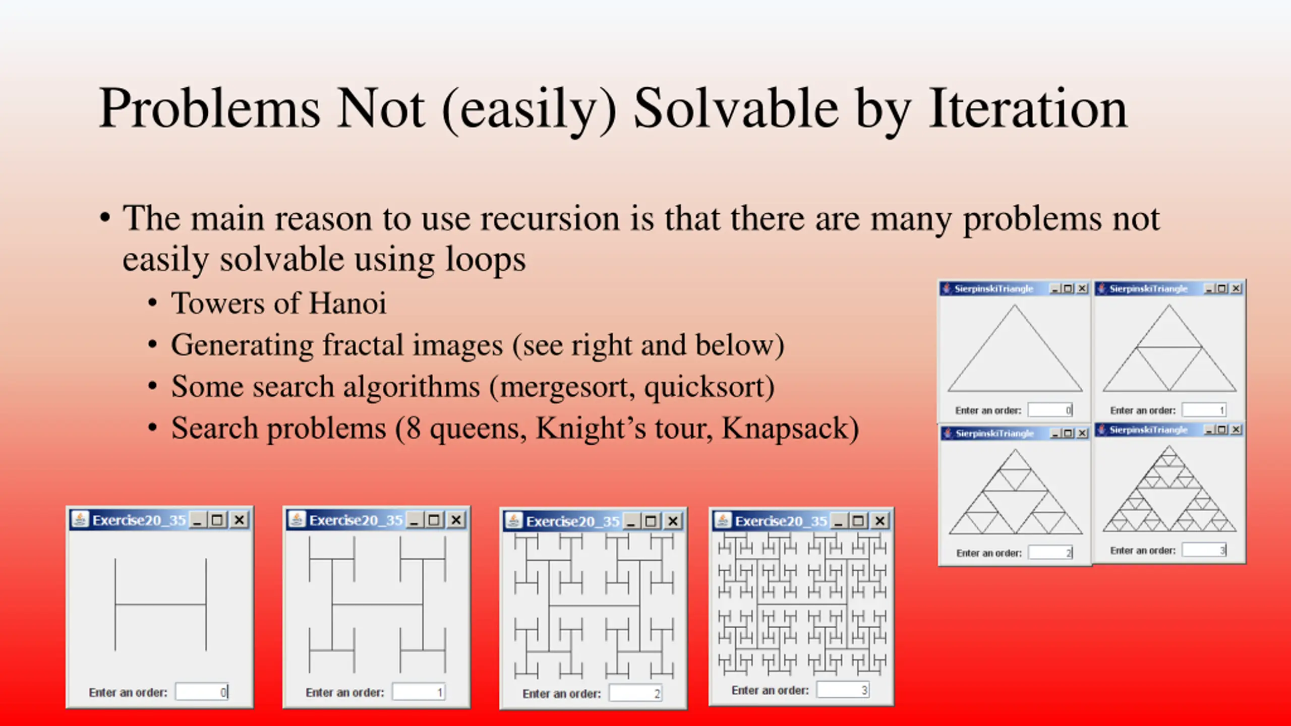 Problems Not (easily) Solvable by Iteration The main reason to use recursion is that there are many problems not easily solvable using loops Towers of Hanoi Generating fractal images (see right and below) Some search algorithms (mergesort, quicksort) Search problems (8 queens, Knight s tour, Knapsack)