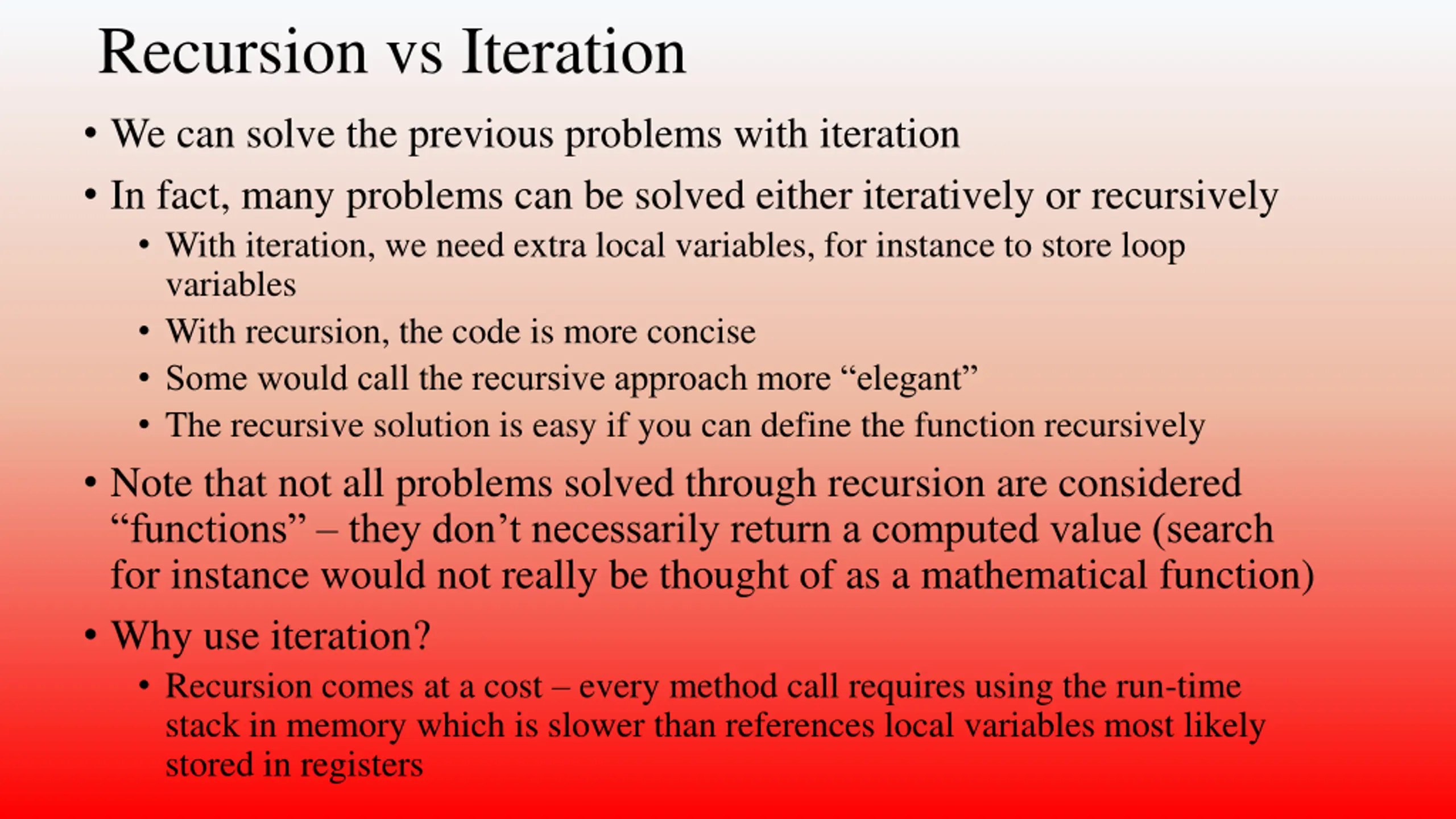 Recursion vs Iteration We can solve the previous problems with iteration In fact, many problems can be solved either iteratively or recursively With iteration, we need extra local variables, for instance to store loop variables With recursion, the code is more concise Some would call the recursive approach more elegant The recursive solution is easy if you can define the function recursively Note that not all problems solved through recursion are considered functions they don t necessarily return a computed value (search for instance would not really be thought of as a mathematical function) Why use iteration? Recursion comes at a cost every method call requires using the run-time stack in memory which is slower than references local variables most likely stored in registers