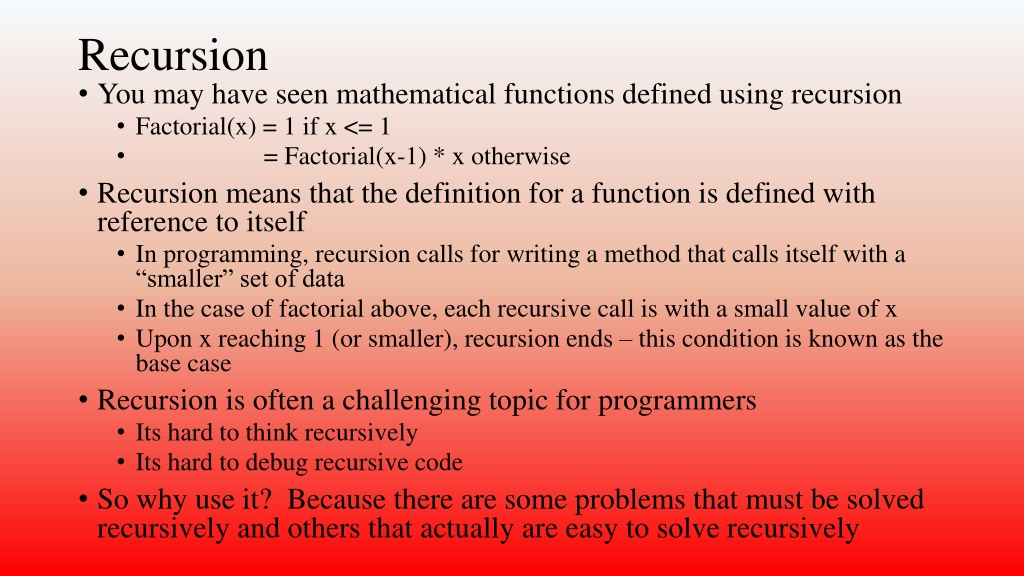 Recursion You may have seen mathematical functions defined using recursion Factorial(x) = 1 if x <= 1 = Factorial(x-1) * x otherwise Recursion means that the definition for a function is defined with reference to itself In programming, recursion calls for writing a method that calls itself with a smaller set of data In the case of factorial above, each recursive call is with a small value of x Upon x reaching 1 (or smaller), recursion ends this condition is known as the base case Recursion is often a challenging topic for programmers Its hard to think recursively Its hard to debug recursive code So why use it? Because there are some problems that must be solved recursively and others that actually are easy to solve recursively