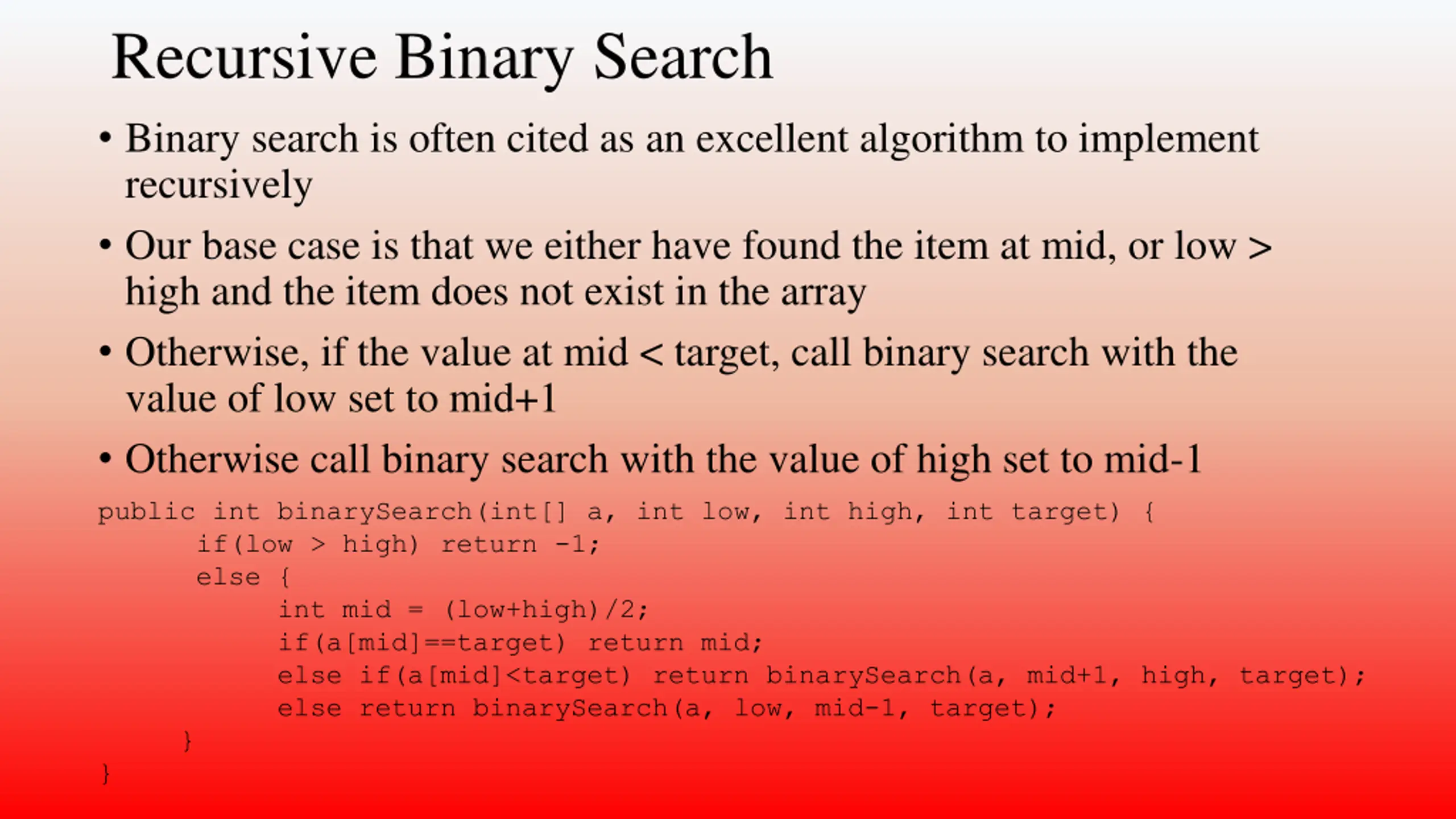 Recursive Binary Search Binary search is often cited as an excellent algorithm to implement recursively Our base case is that we either have found the item at mid, or low > high and the item does not exist in the array Otherwise, if the value at mid < target, call binary search with the value of low set to mid+1 Otherwise call binary search with the value of high set to mid-1 public int binarySearch(int[] a, int low, int high, int target) { if(low > high) return -1; else { int mid = (low+high)/2; if(a[mid]==target) return mid; else if(a[mid]<target) return binarySearch(a, mid+1, high, target); else return binarySearch(a, low, mid-1, target); } }