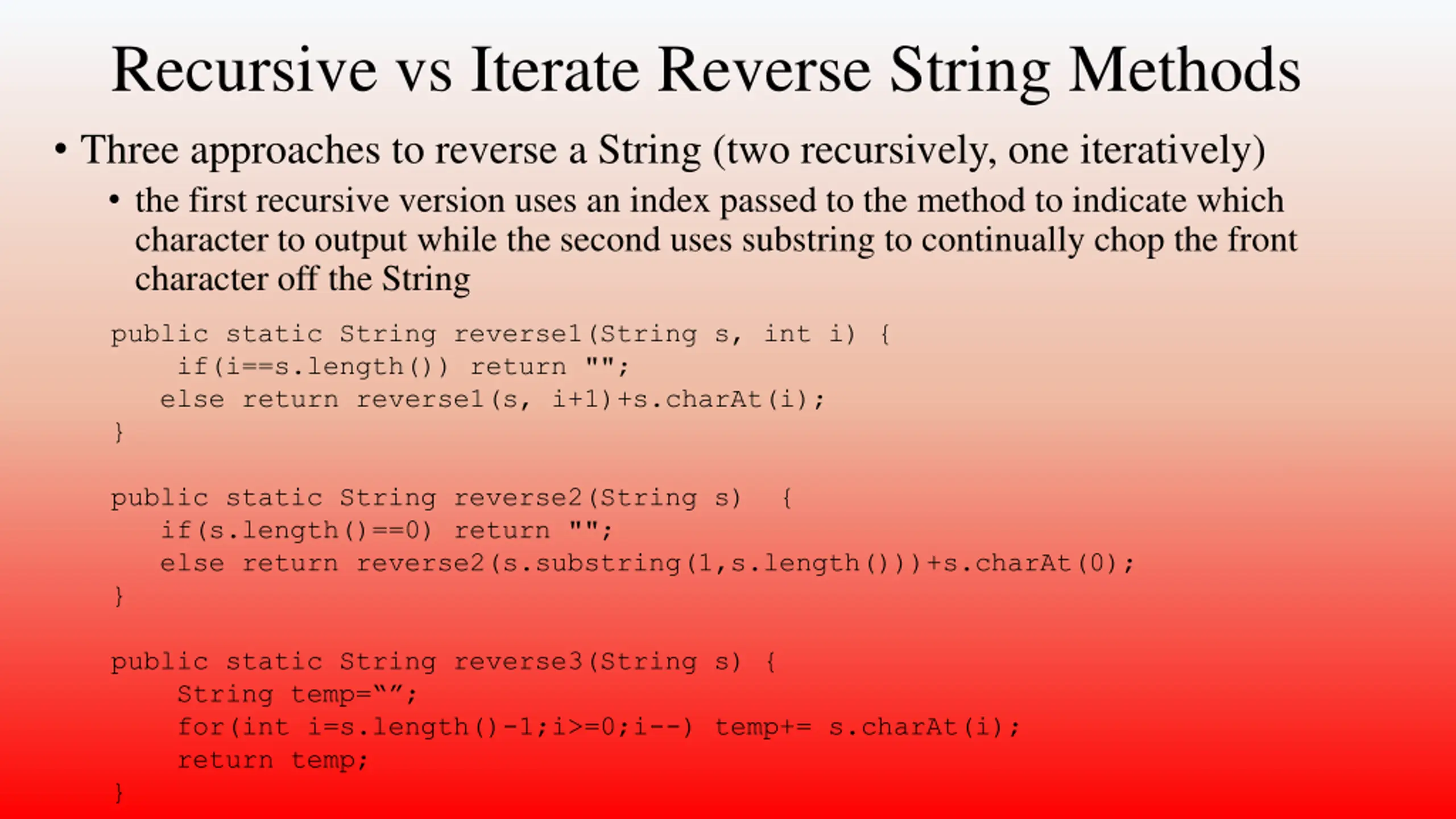 Recursive vs Iterate Reverse String Methods Three approaches to reverse a String (two recursively, one iteratively) the first recursive version uses an index passed to the method to indicate which character to output while the second uses substring to continually chop the front character off the String public static String reverse1(String s, int i) { if(i==s.length()) return ""; else return reverse1(s, i+1)+s.charAt(i); } public static String reverse2(String s) { if(s.length()==0) return ""; else return reverse2(s.substring(1,s.length()))+s.charAt(0); } public static String reverse3(String s) { String temp= ; for(int i=s.length()-1;i>=0;i--) temp+= s.charAt(i); return temp; }