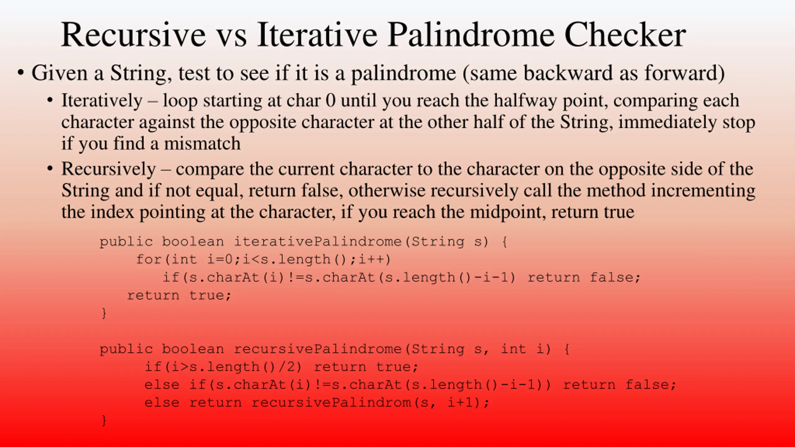 Recursive vs Iterative Palindrome Checker Given a String, test to see if it is a palindrome (same backward as forward) Iteratively loop starting at char 0 until you reach the halfway point, comparing each character against the opposite character at the other half of the String, immediately stop if you find a mismatch Recursively compare the current character to the character on the opposite side of the String and if not equal, return false, otherwise recursively call the method incrementing the index pointing at the character, if you reach the midpoint, return true public boolean iterativePalindrome(String s) { for(int i=0;i<s.length();i++) if(s.charAt(i)!=s.charAt(s.length()-i-1) return false; return true; } public boolean recursivePalindrome(String s, int i) { if(i>s.length()/2) return true; else if(s.charAt(i)!=s.charAt(s.length()-i-1)) return false; else return recursivePalindrom(s, i+1); }