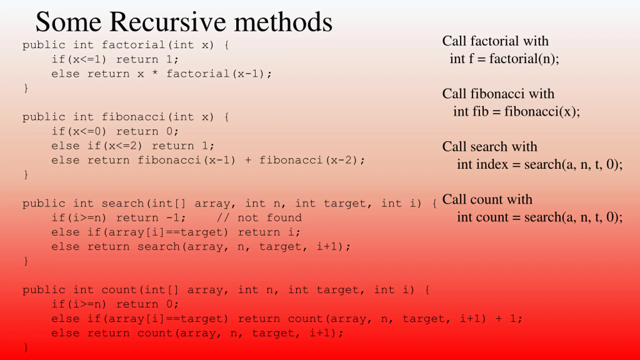 Some Recursive methods public int factorial(int x) { if(x<=1) return 1; else return x * factorial(x-1); } Call factorial with int f = factorial(n); Call fibonacci with int fib = fibonacci(x); public int fibonacci(int x) { if(x<=0) return 0; else if(x<=2) return 1; else return fibonacci(x-1) + fibonacci(x-2); } Call search with int index = search(a, n, t, 0); Call count with int count = search(a, n, t, 0); public int search(int[] array, int n, int target, int i) { if(i>=n) return -1; // not found else if(array[i]==target) return i; else return search(array, n, target, i+1); } public int count(int[] array, int n, int target, int i) { if(i>=n) return 0; else if(array[i]==target) return count(array, n, target, i+1) + 1; else return count(array, n, target, i+1); }
