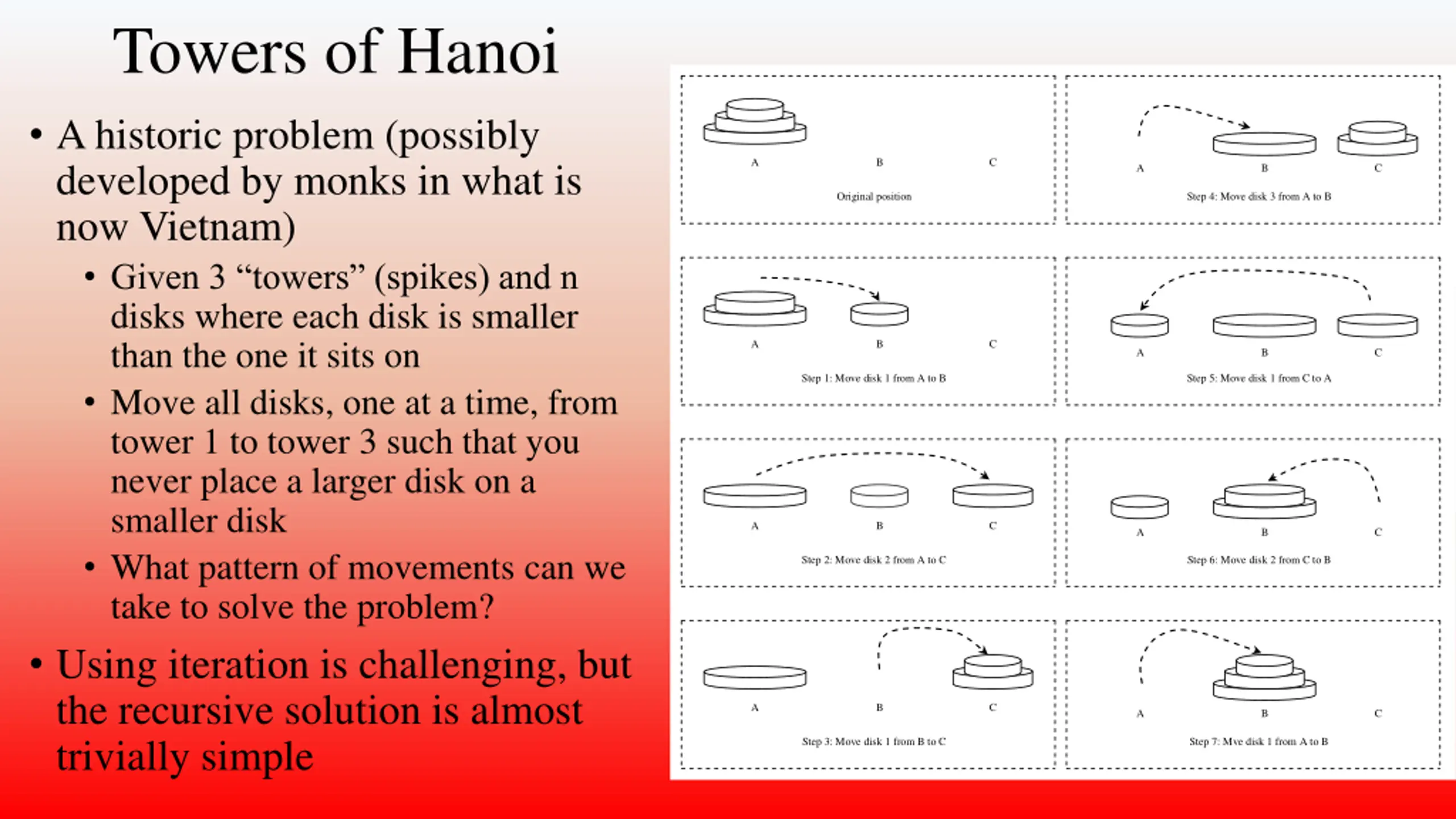 Towers of Hanoi A historic problem (possibly developed by monks in what is now Vietnam) Given 3 towers (spikes) and n disks where each disk is smaller than the one it sits on Move all disks, one at a time, from tower 1 to tower 3 such that you never place a larger disk on a smaller disk What pattern of movements can we take to solve the problem? Using iteration is challenging, but the recursive solution is almost trivially simple A B C A B C Original position Step 4: Move disk 3 from A to B A B C A B C Step 1: Move disk 1 from A to B Step 5: Move disk 1 from C to A A B C A B C Step 2: Move disk 2 from A to C Step 6: Move disk 2 from C to B A B C A B C Step 3: Move disk 1 from B to C Step 7: Mve disk 1 from A to B