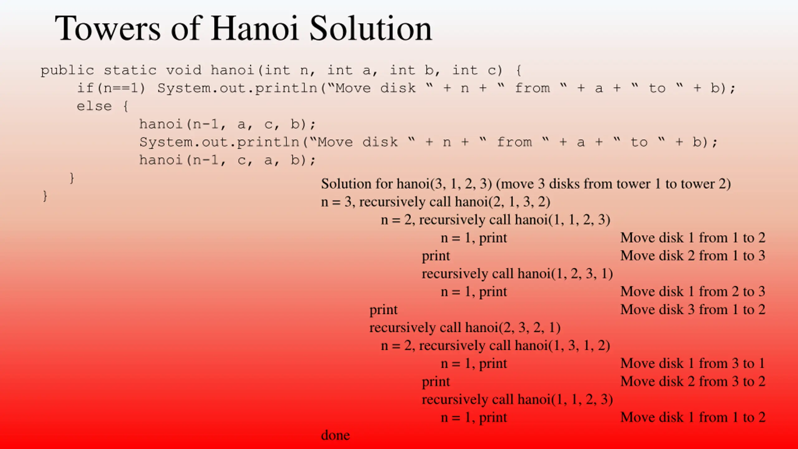 Towers of Hanoi Solution public static void hanoi(int n, int a, int b, int c) { if(n==1) System.out.println( Move disk + n + from + a + to + b); else { hanoi(n-1, a, c, b); System.out.println( Move disk + n + from + a + to + b); hanoi(n-1, c, a, b); } } n = 3, recursively call hanoi(2, 1, 3, 2) n = 2, recursively call hanoi(1, 1, 2, 3) print recursively call hanoi(1, 2, 3, 1) print recursively call hanoi(2, 3, 2, 1) n = 2, recursively call hanoi(1, 3, 1, 2) print recursively call hanoi(1, 1, 2, 3) done Solution for hanoi(3, 1, 2, 3) (move 3 disks from tower 1 to tower 2) n = 1, print Move disk 1 from 1 to 2 Move disk 2 from 1 to 3 n = 1, print Move disk 1 from 2 to 3 Move disk 3 from 1 to 2 n = 1, print Move disk 1 from 3 to 1 Move disk 2 from 3 to 2 n = 1, print Move disk 1 from 1 to 2