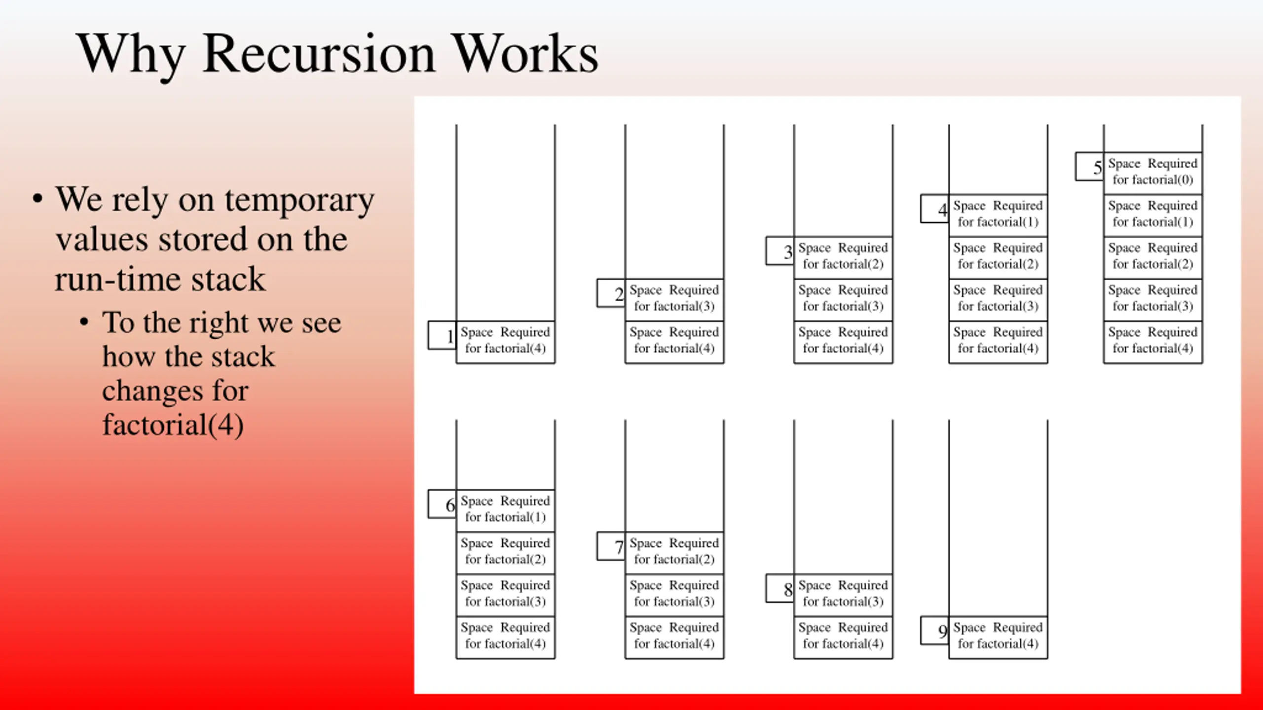 Why Recursion Works Space Required for factorial(0) 5 We rely on temporary values stored on the run-time stack To the right we see how the stack changes for factorial(4) Space Required for factorial(1) Space Required for factorial(1) 4 Space Required for factorial(2) Space Required for factorial(2) Space Required for factorial(2) 3 2Space Required for factorial(3) Space Required for factorial(3) Space Required for factorial(3) Space Required for factorial(3) Space Required for factorial(4) Space Required for factorial(4) Space Required for factorial(4) Space Required for factorial(4) Space Required for factorial(4) 1 Space Required for factorial(1) 6 Space Required for factorial(2) Space Required for factorial(2) 7 Space Required for factorial(3) Space Required for factorial(3) 8Space Required for factorial(3) Space Required for factorial(4) Space Required for factorial(4) Space Required for factorial(4) Space Required for factorial(4) 9