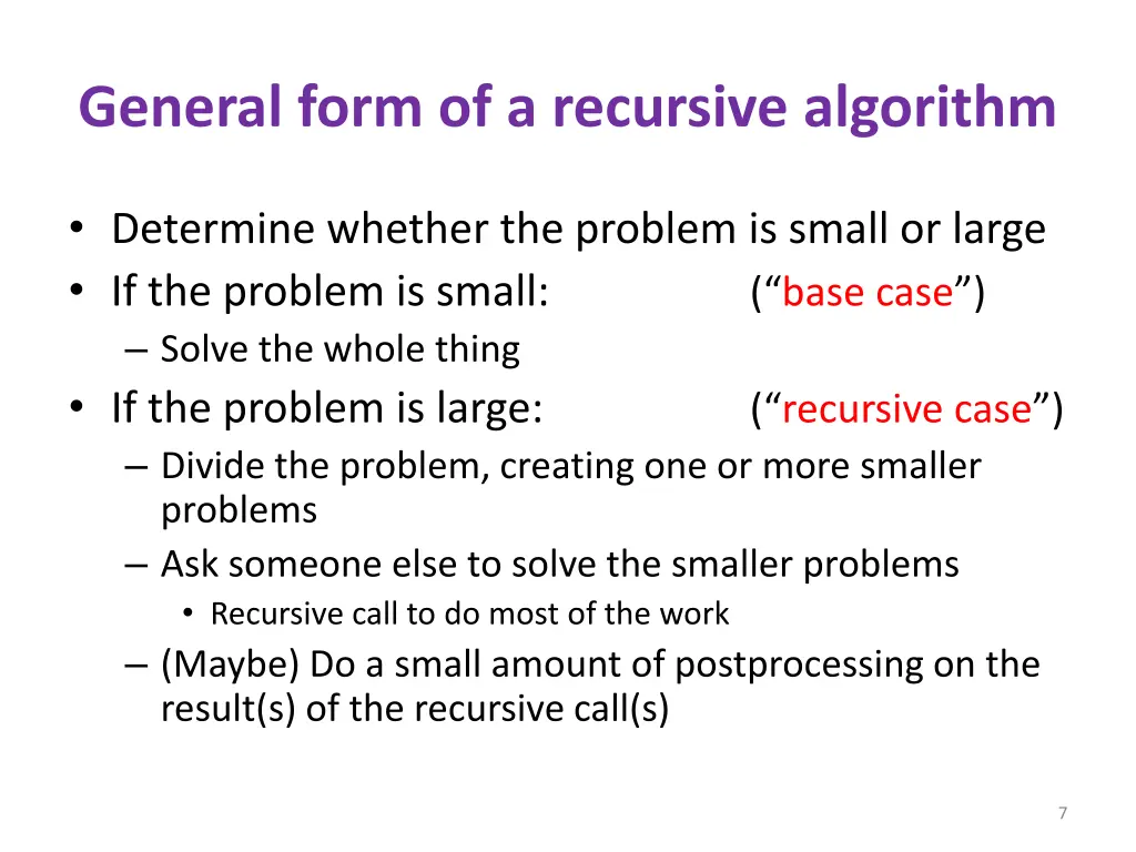 General form of a recursive algorithm Determine whether the problem is small or large If the problem is small: Solve the whole thing If the problem is large: Divide the problem, creating one or more smaller problems Ask someone else to solve the smaller problems Recursive call to do most of the work (Maybe) Do a small amount of postprocessing on the result(s) of the recursive call(s) ( base case ) ( recursive case ) 7