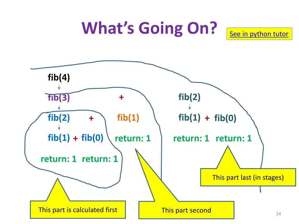 Whats Going On? See in python tutor fib(4) + fib(2) fib(3) fib(1) fib(1) fib(2) + + fib(0) fib(1) fib(0) + return: 1 return: 1 return: 1 return: 1 return: 1 This part last (in stages) This part is calculated first This part second 14