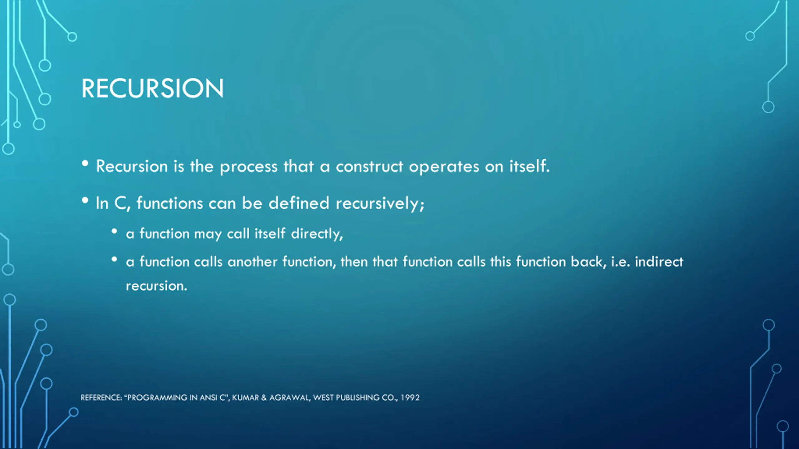 RECURSION Recursion is the process that a construct operates on itself. In C, functions can be defined recursively; a function may call itself directly, a function calls another function, then that function calls this function back, i.e. indirect recursion. REFERENCE: PROGRAMMING IN ANSI C , KUMAR & AGRAWAL, WEST PUBLISHING CO., 1992