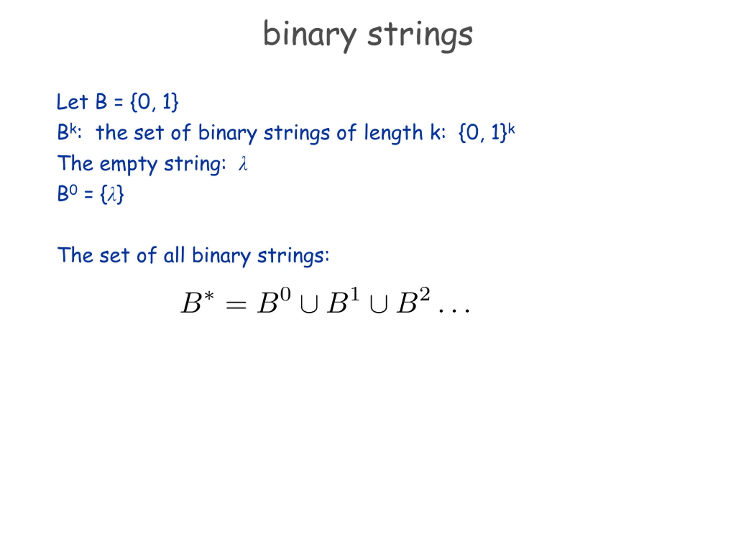 binary strings Let B = {0, 1} Bk: the set of binary strings of length k: {0, 1}k The empty string: B0 = { } The set of all binary strings:
