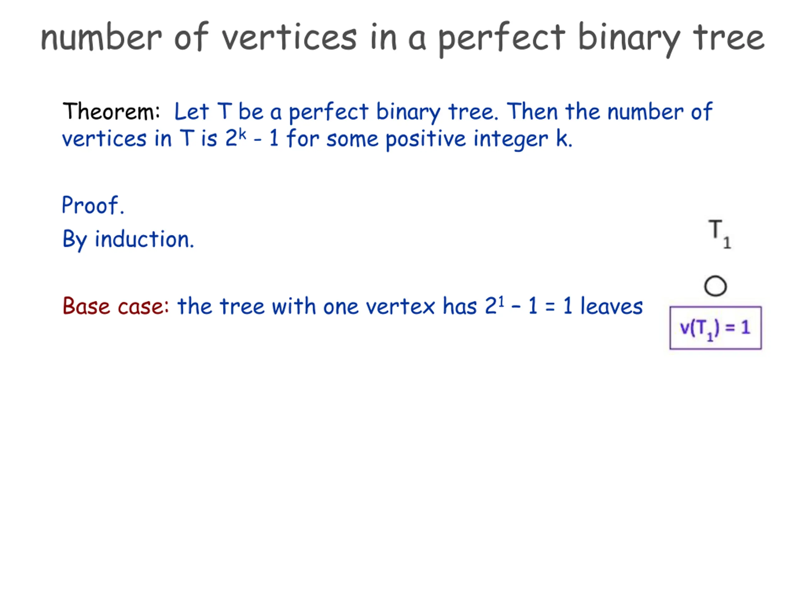 number of vertices in a perfect binary tree Theorem: Let T be a perfect binary tree. Then the number of vertices in T is 2k - 1 for some positive integer k. Proof. By induction. Base case: the tree with one vertex has 21 1 = 1 leaves