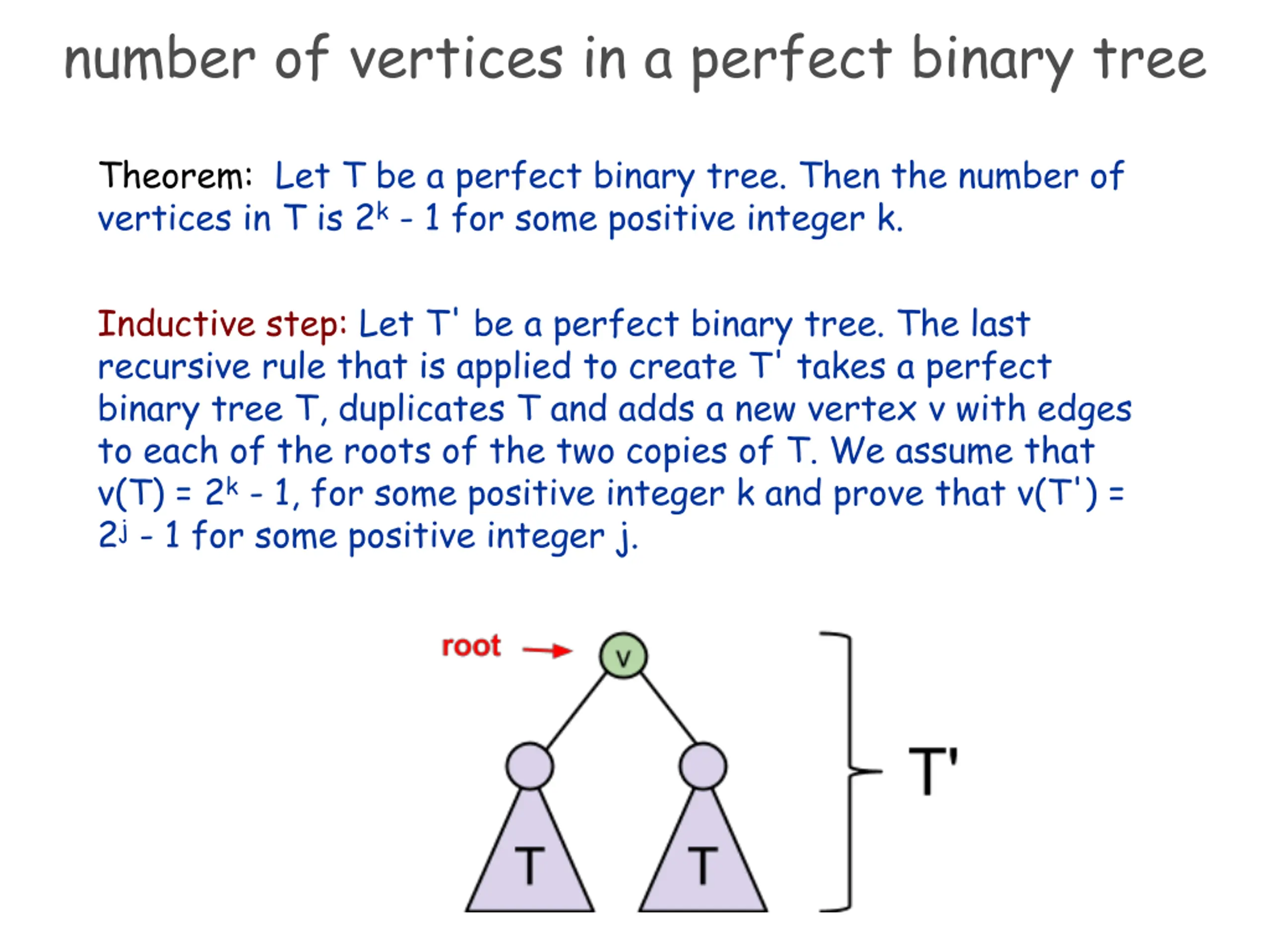 number of vertices in a perfect binary tree Theorem: Let T be a perfect binary tree. Then the number of vertices in T is 2k - 1 for some positive integer k. Inductive step: Let T' be a perfect binary tree. The last recursive rule that is applied to create T' takes a perfect binary tree T, duplicates T and adds a new vertex v with edges to each of the roots of the two copies of T. We assume that v(T) = 2k - 1, for some positive integer k and prove that v(T') = 2j - 1 for some positive integer j.