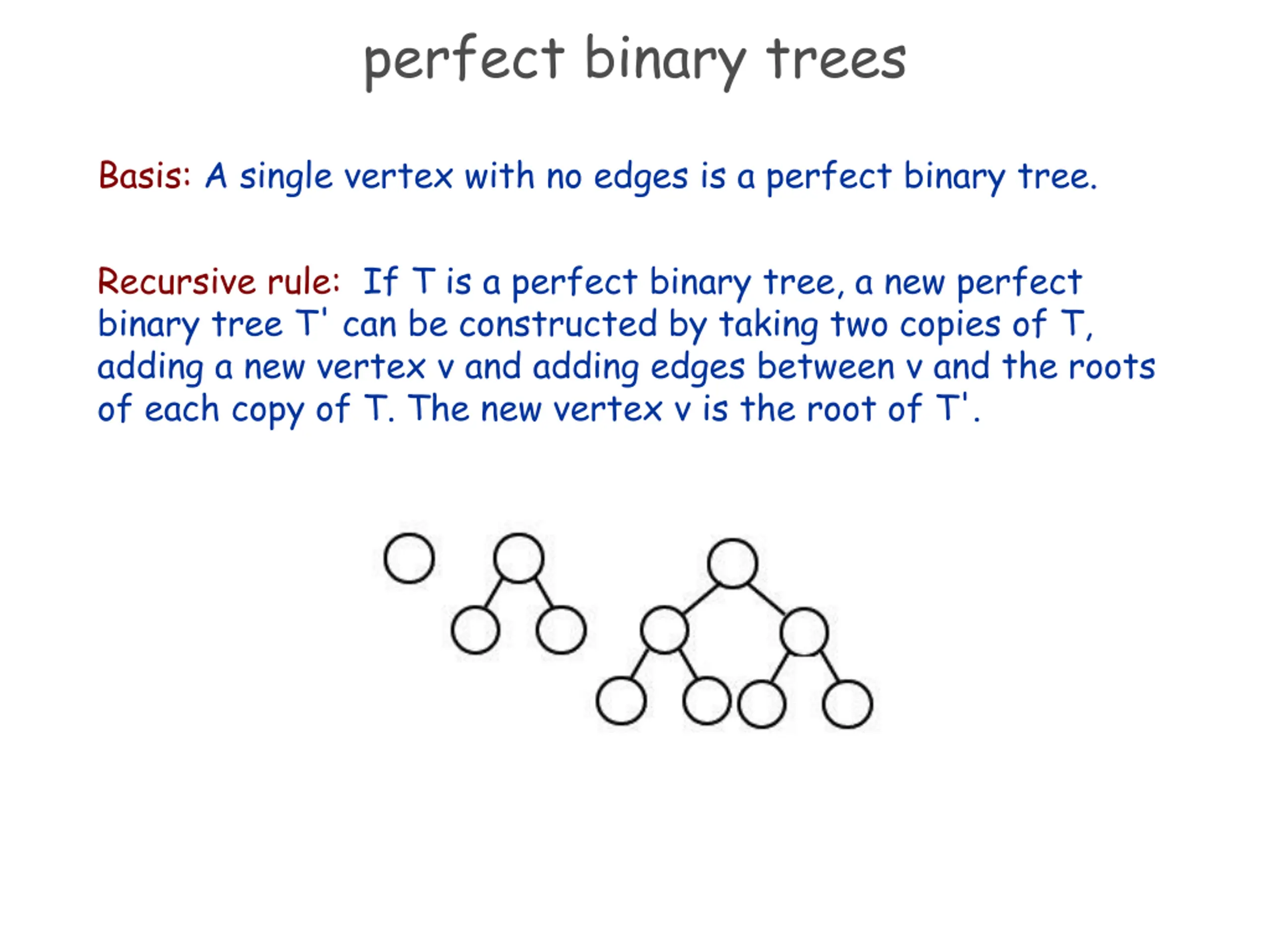 perfect binary trees Basis: A single vertex with no edges is a perfect binary tree. Recursive rule: If T is a perfect binary tree, a new perfect binary tree T' can be constructed by taking two copies of T, adding a new vertex v and adding edges between v and the roots of each copy of T. The new vertex v is the root of T'.